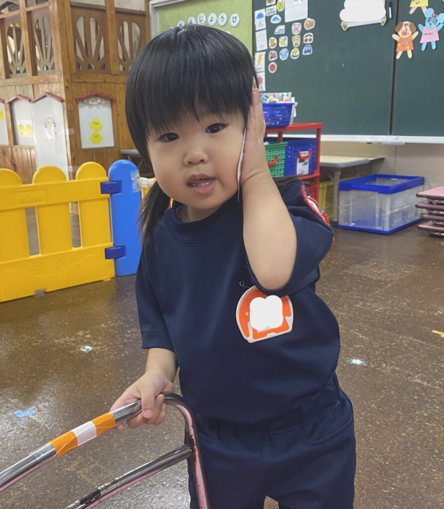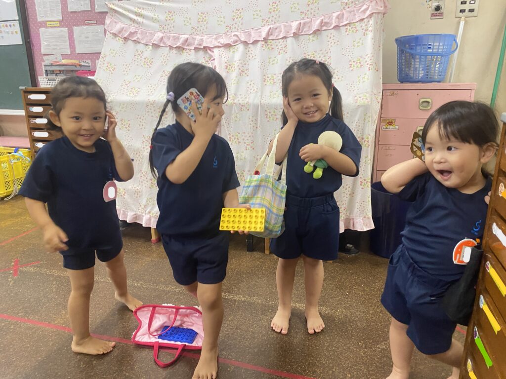 パンダ組のあそびの中でレゴブロックをスマートフォンに見立てて「もしもし~」と電話をかけて遊ぶ子どもがいました。