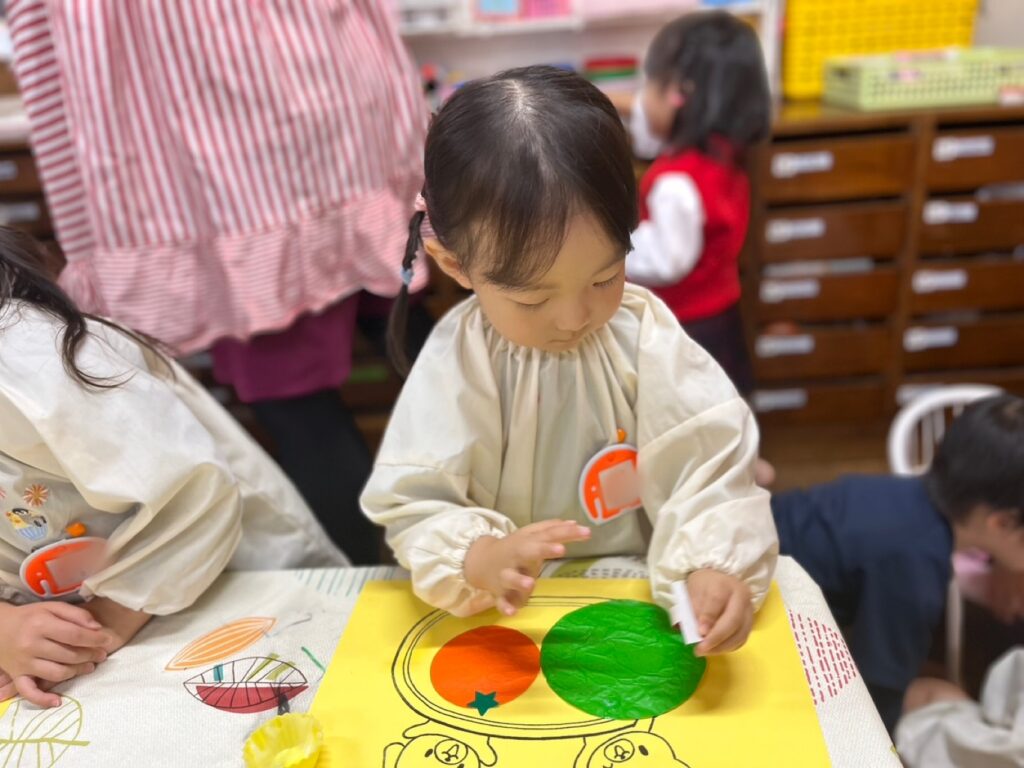 満3歳児パンダ組では、「オレンジ・めろん」の製作をしました。