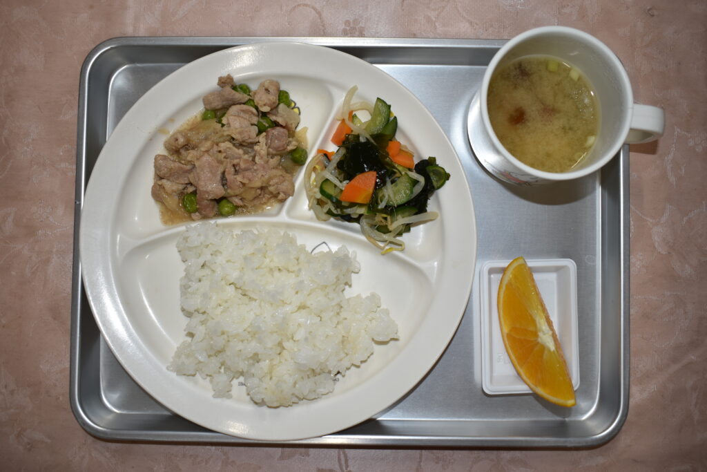 10/24 ごはん 豆腐となめこの味噌汁 豚肉の生姜焼き わかめの酢の物 オレンジ