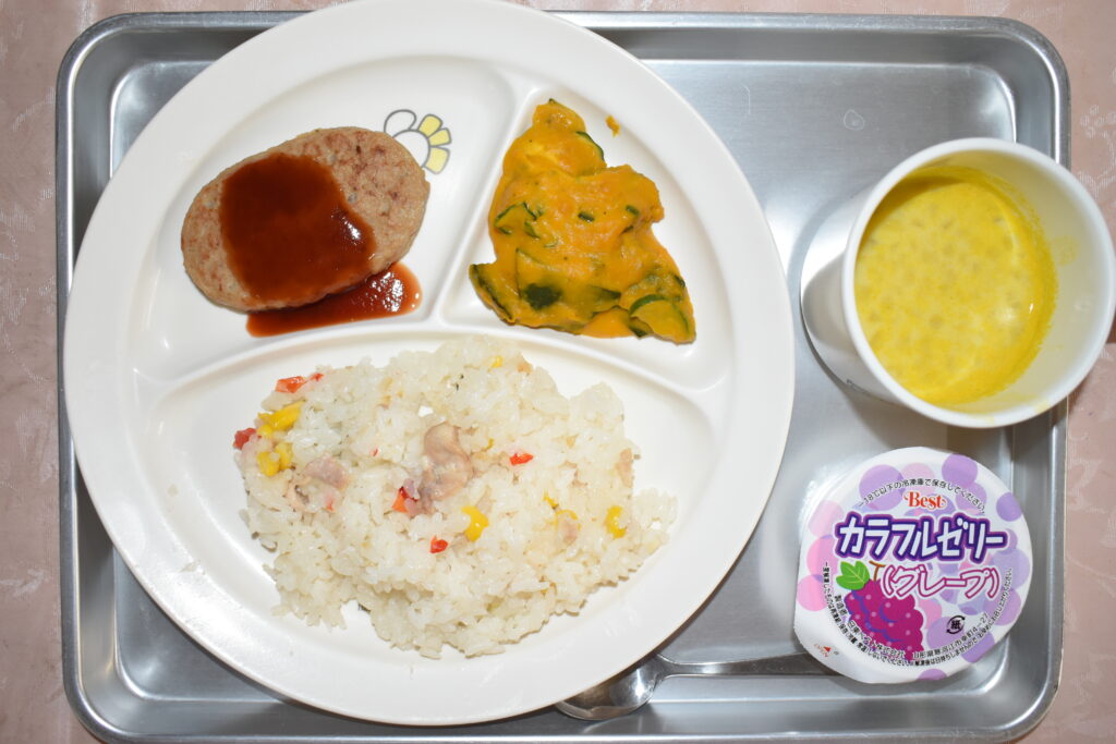 【10/31 ハロウィンメニュー】チキンピラフ 豆乳パンプキンスープ ハンバーグ パンプキンサラダ ぶどうゼリー