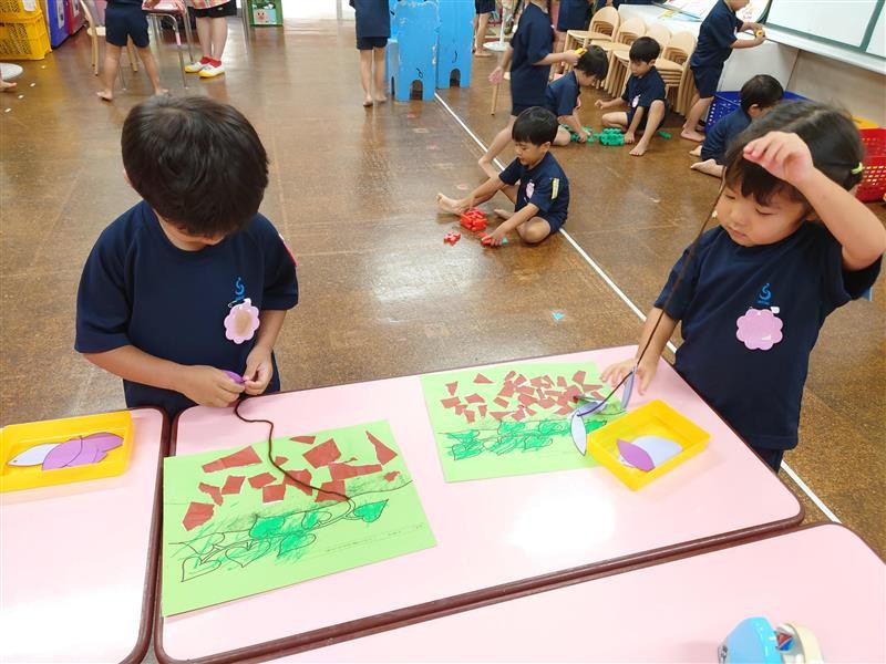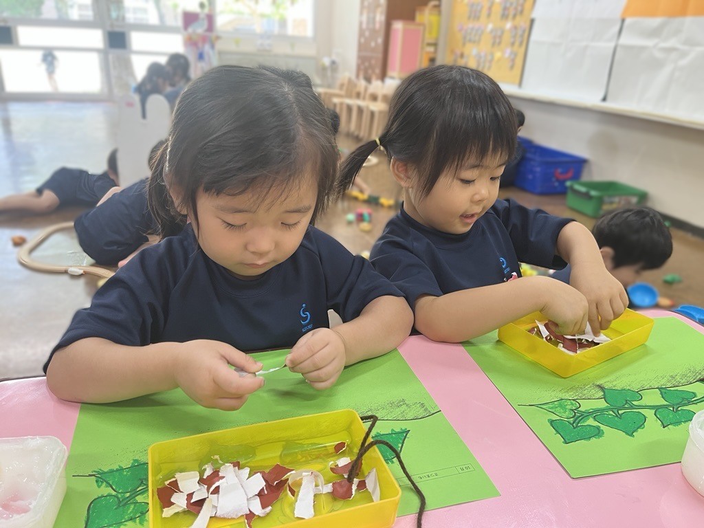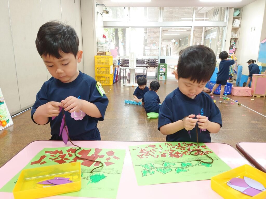手先を使って折り紙をちぎったり紐通しをしたりすることをねらいとしています。