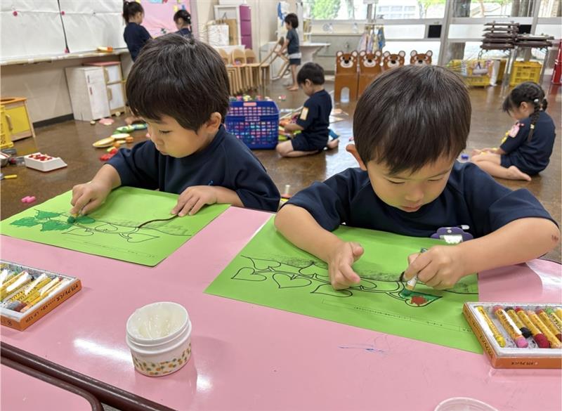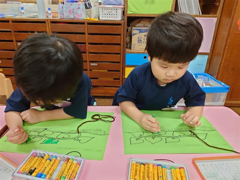 さつまいもの葉っぱは緑であることを伝え、「緑はこれだよ!!」とクレパスを手に取る姿がありました😊