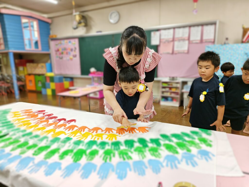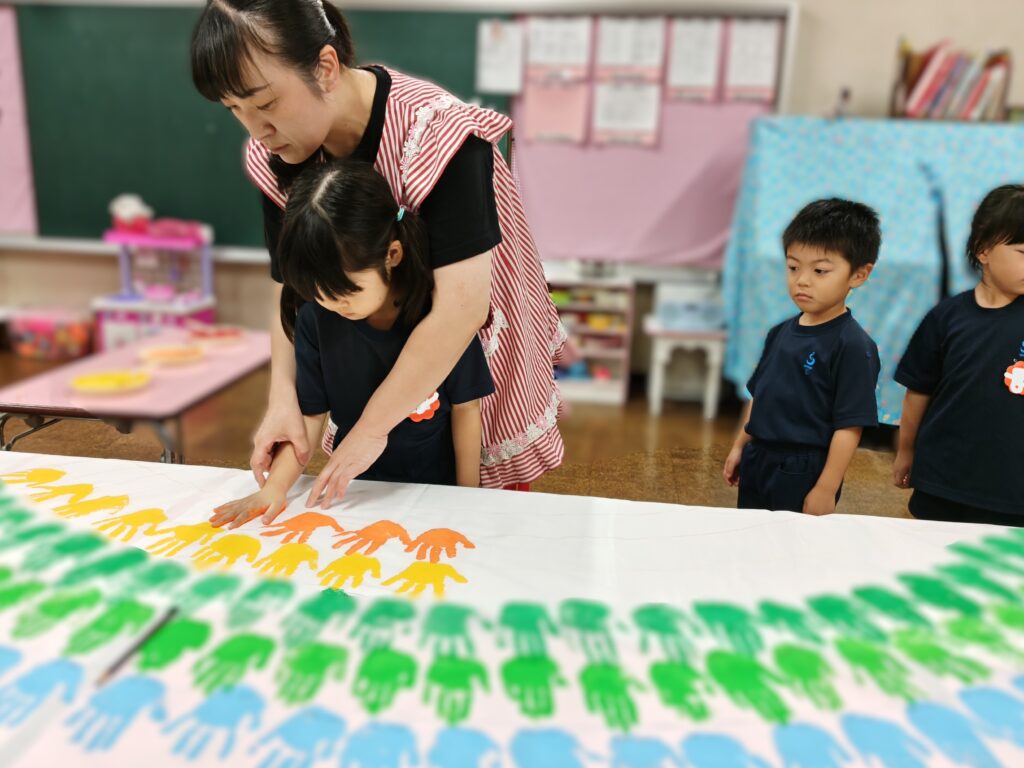 全園児一人ひとりの手形を、それぞれのクラスカラーで押しました✋💖