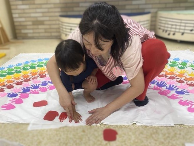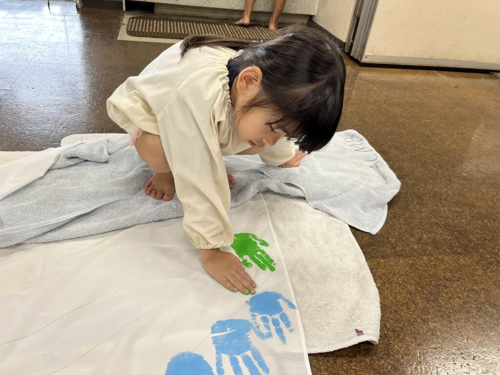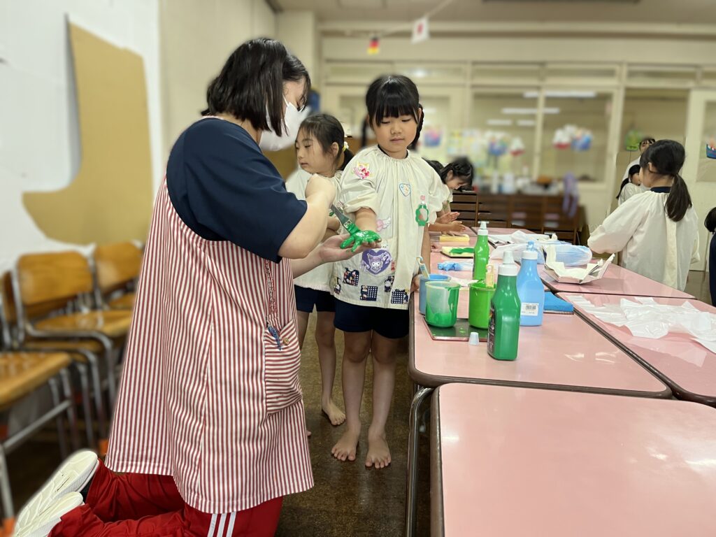 先生と一緒に製作しながら「絵の具冷たい😲」「たのしい!」と話していましたよ!