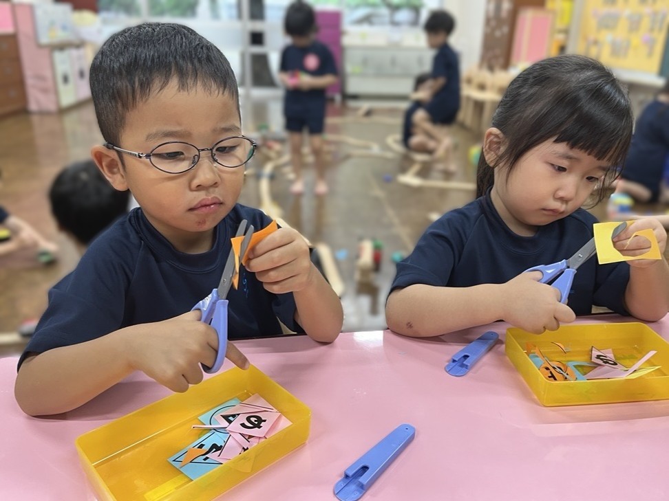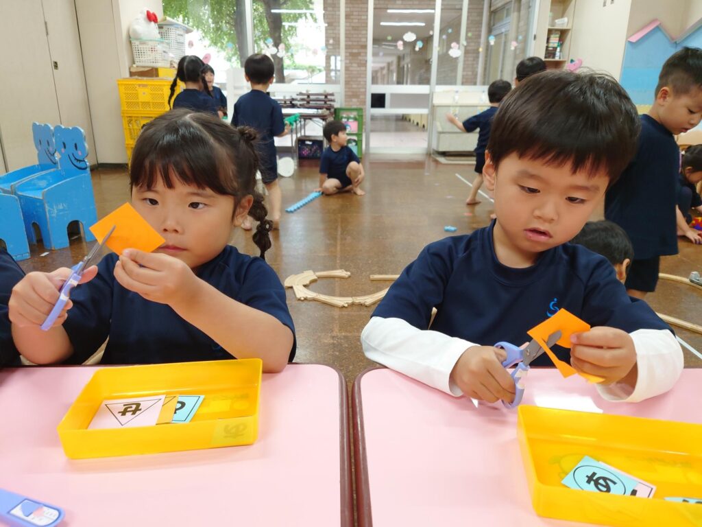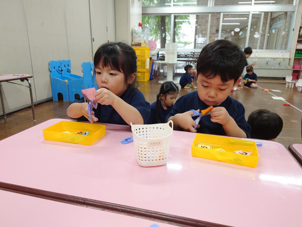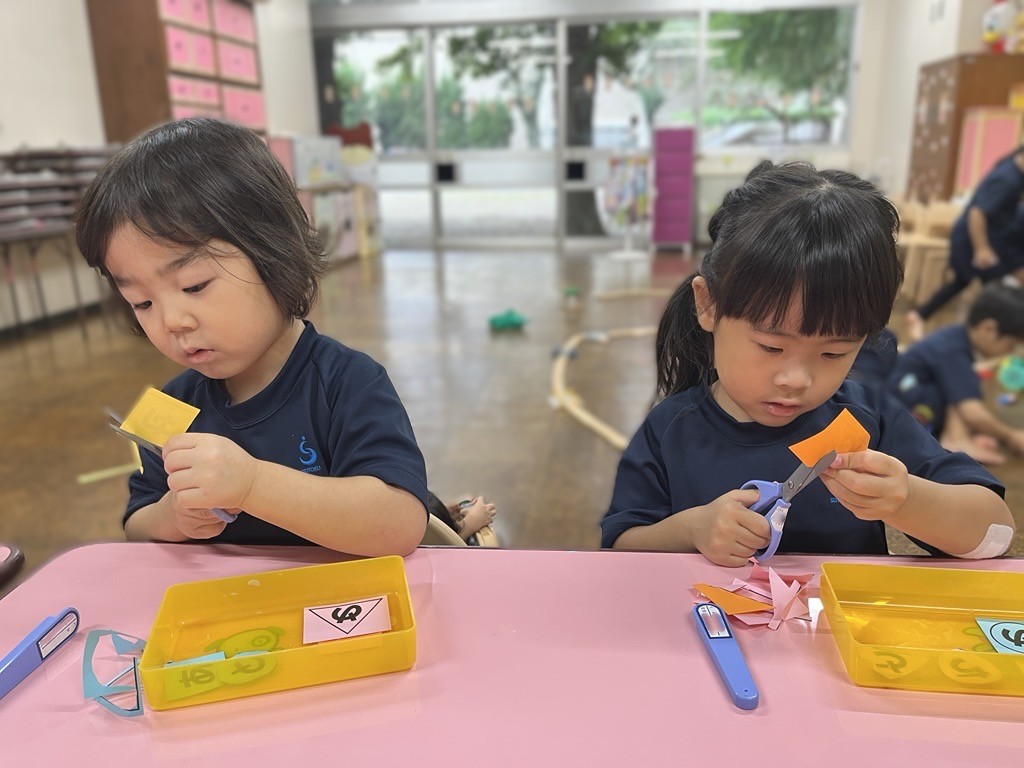 真剣な表情で切り、切り終わると「できたよ!」と笑顔で先生に見せる姿がありました😊
