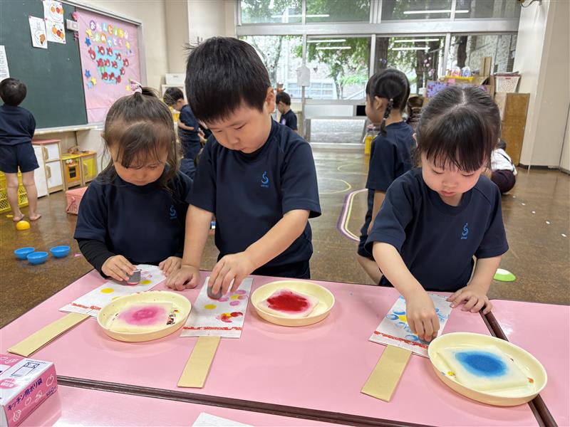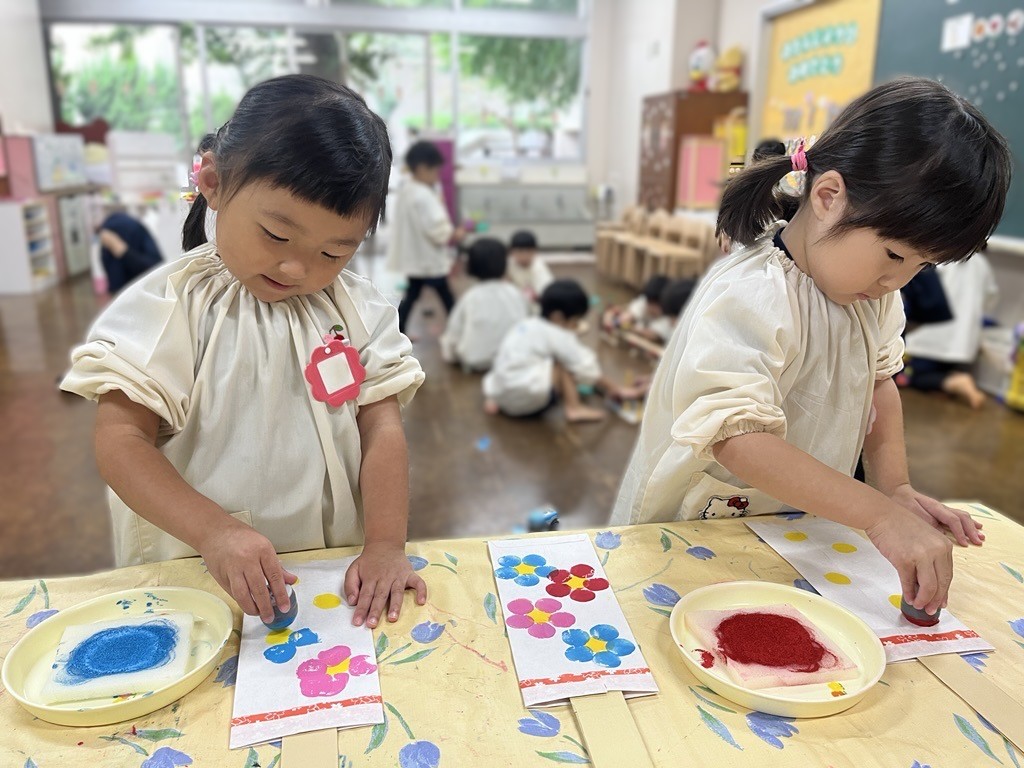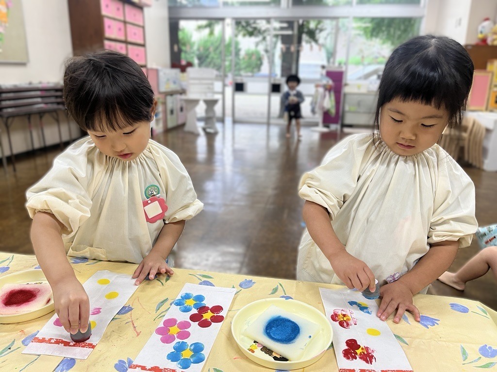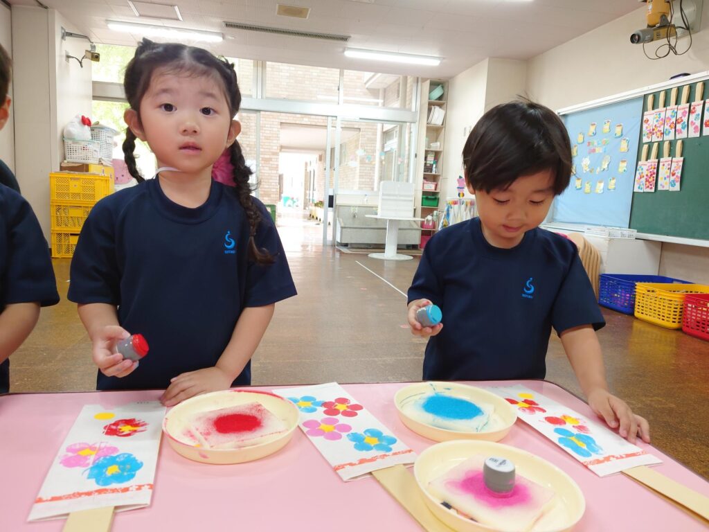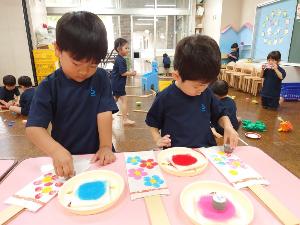 いつもより少し小さい花の貼紙で、糊の量が多くなってしまう子どもがいましたが、1本の指で少しずつ糊をつけることを伝えながら行いました👆💡