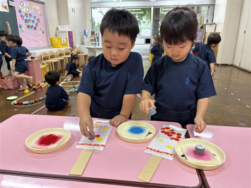 先生がスタンプした黄色の丸の周りに赤・ピンク・水色の丸のスタンプをして花の形にします🌼