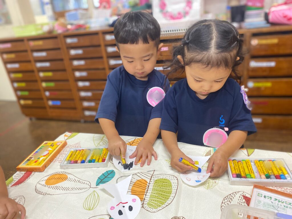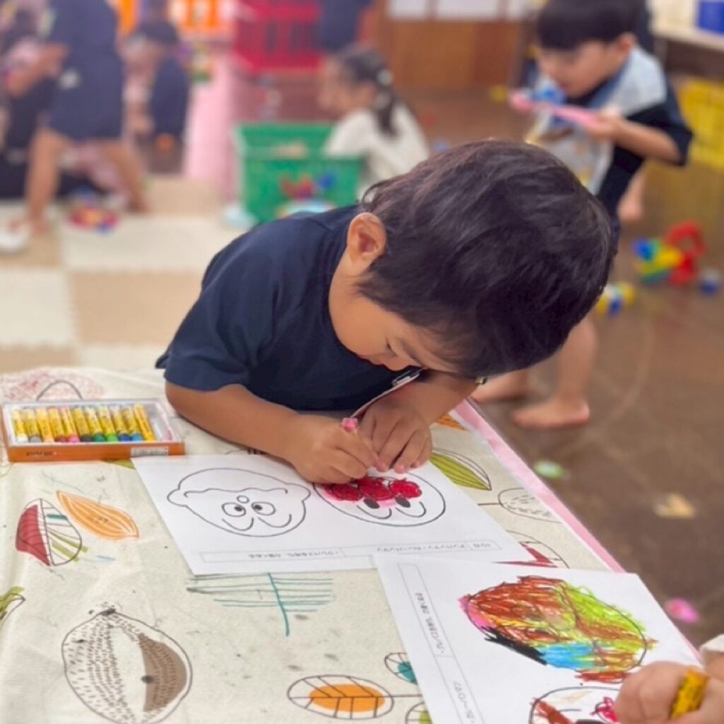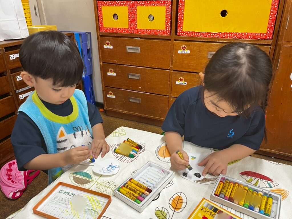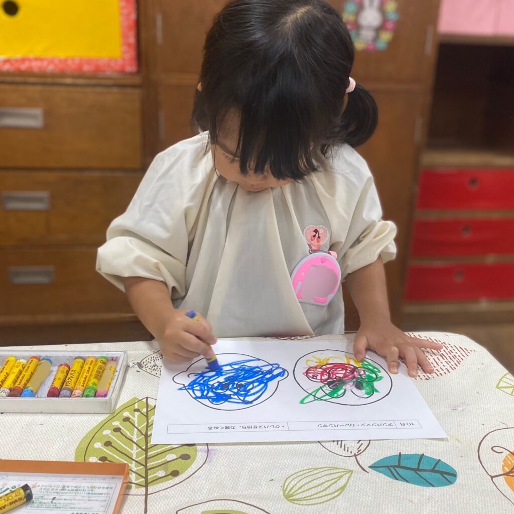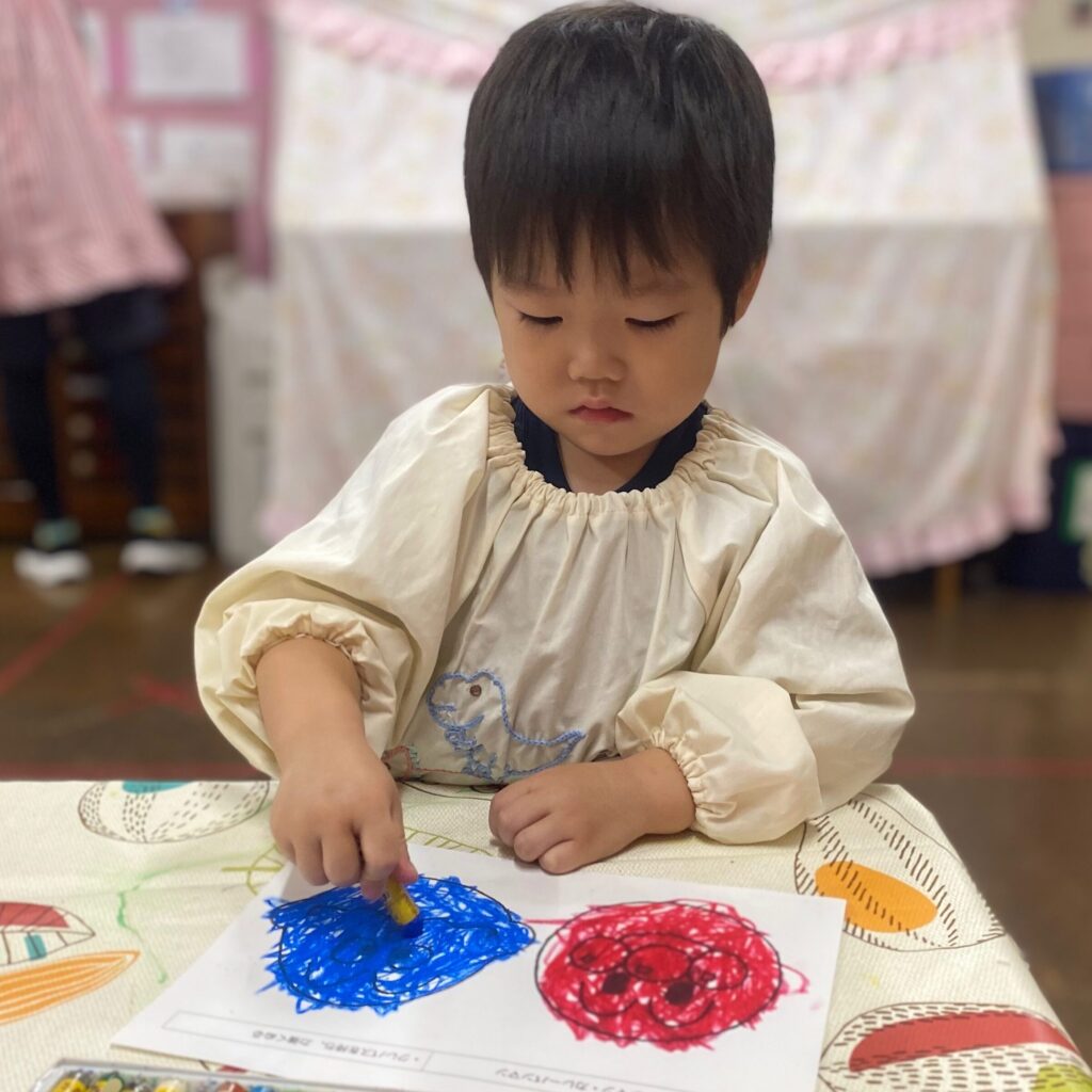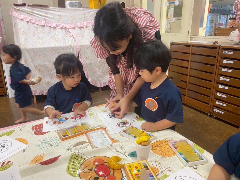 みんなの大好きなアンパンマンとカレーパンマンということで、パンダ組の子どもたちも自分から進んでクレパスを持ってきて喜んで取り組む姿がみられました🖍