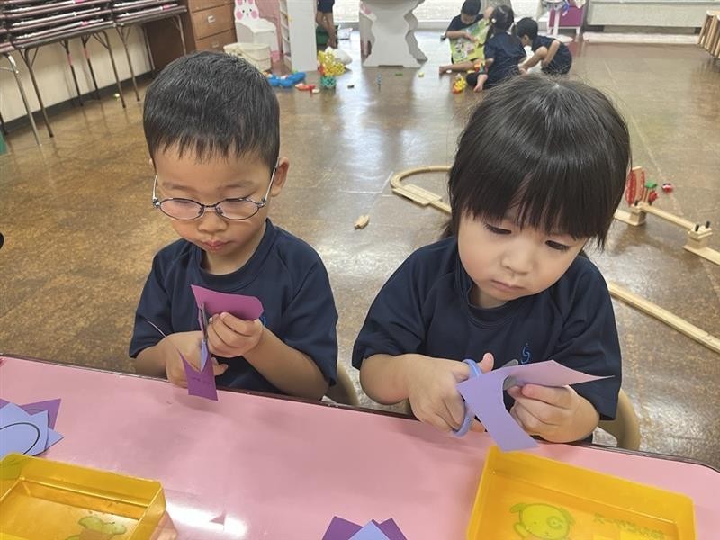 紙を回しながら切ることが難しく、真剣な表情で取り組んでいました😐!