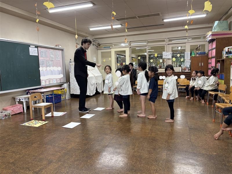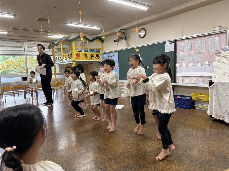 はじめに、英語のうたに合わせてご挨拶の踊りをしたり、先生の名前を聞いたりしましたね。