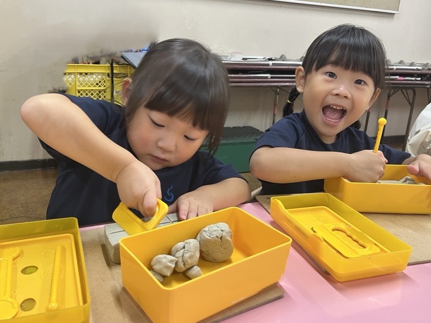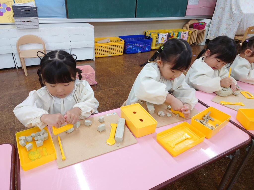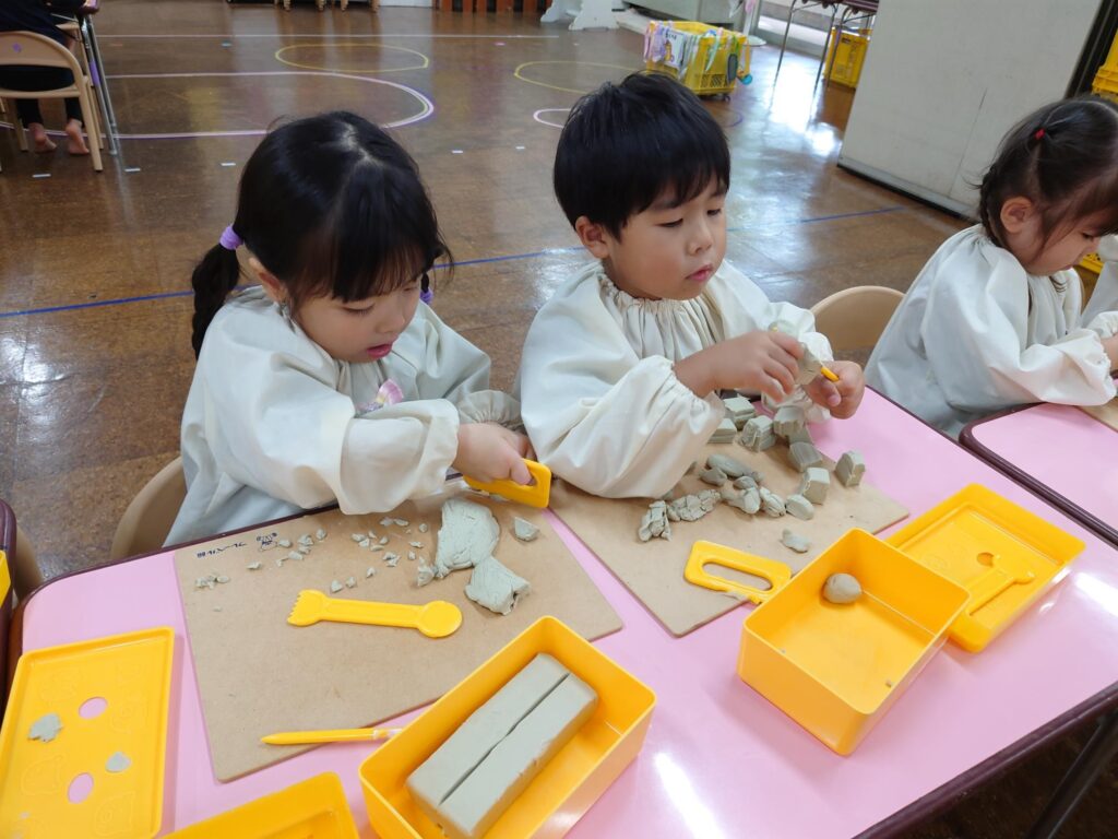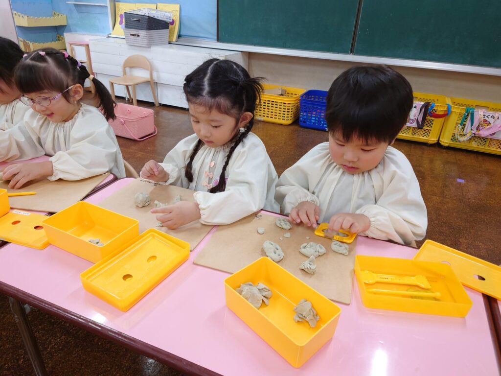 3歳児桜組では、自由あそびの時間に自分で粘土を出して粘土あそびをしています!