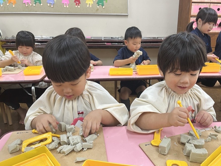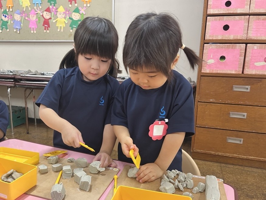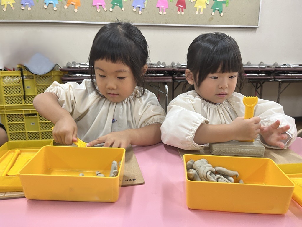 粘土を切ったり、穴をあけたり、模様をつけたり、自分なりに考えて遊んでいましたね🥰