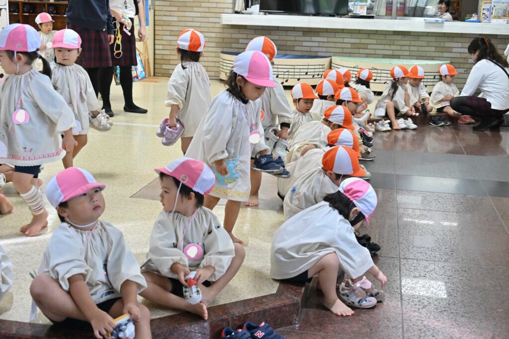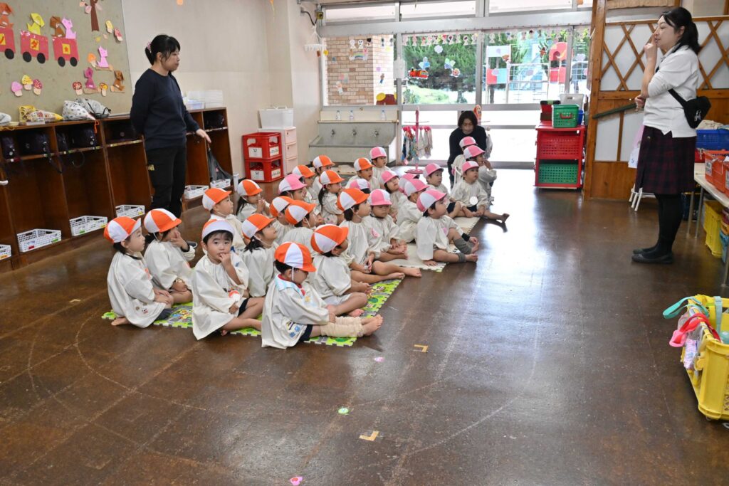 カラー帽子を被り遠足の約束を先生から聞きました✨