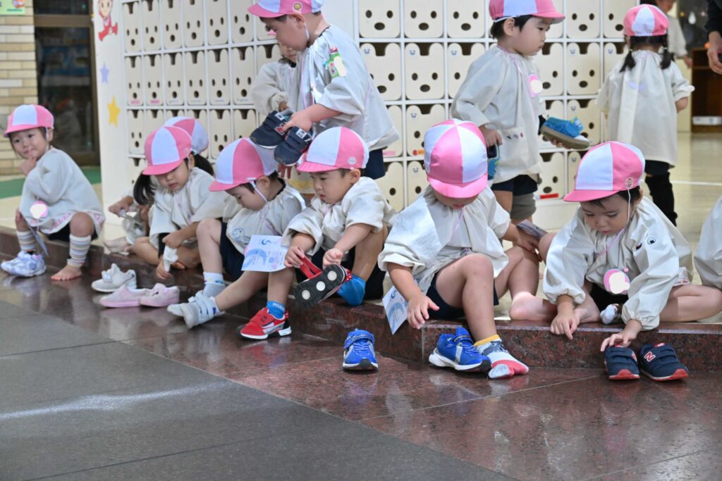 玄関で靴と靴下を履いて…みんな自分で履こうと一所懸命です🐼