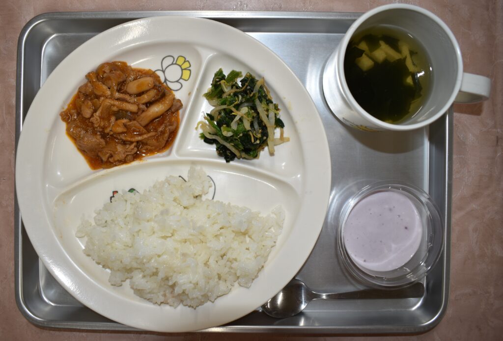 11/11 ごはん 高野豆腐のすまし汁 ポークチャップ ほうれん草の胡麻和え ブルーベリーヨーグルト