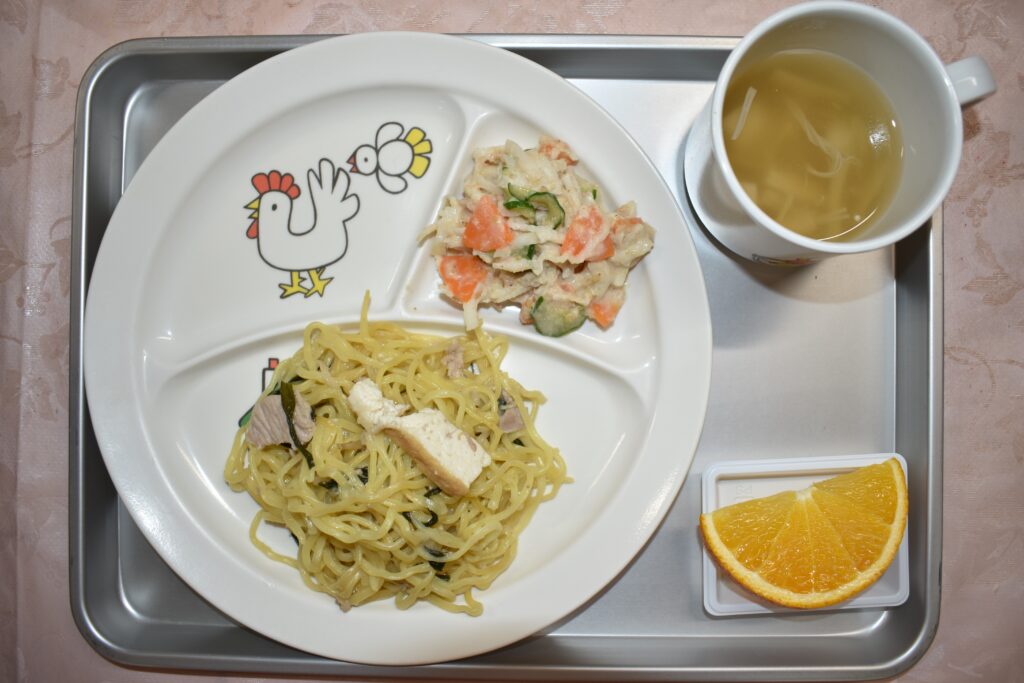 11/17 中華麺 里芋の味噌汁 豚肉のねぎ塩炒め 切干大根のごまマヨネーズ和え オレンジ