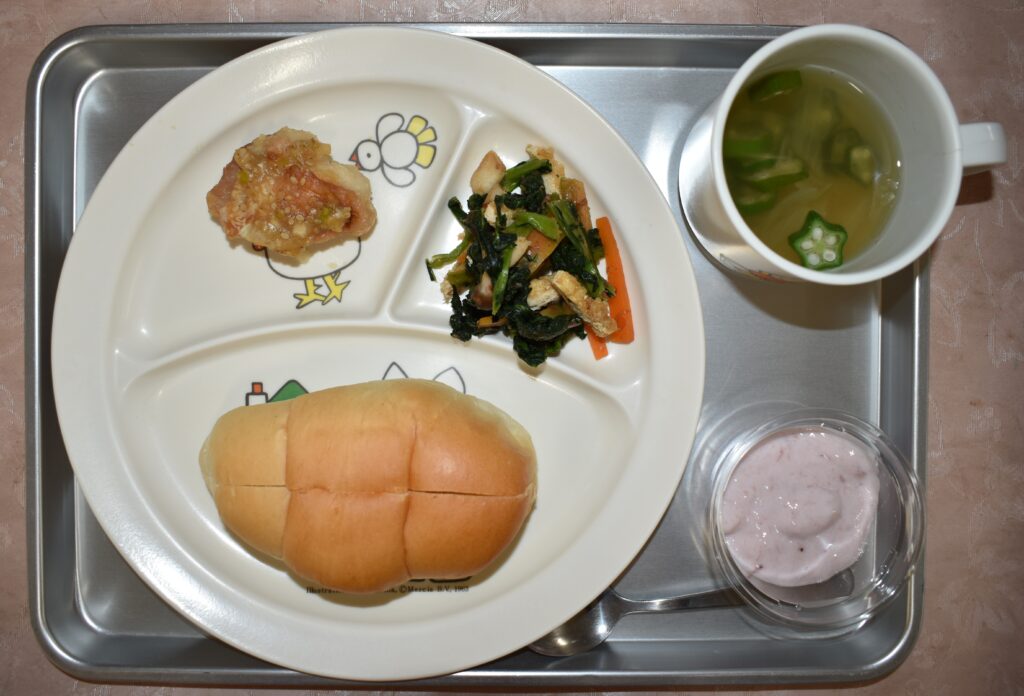 11/21 ロールパン オクラのすまし汁 鶏肉のごま味噌焼き 小松菜ときのこのおひたし いちごフルーチェ