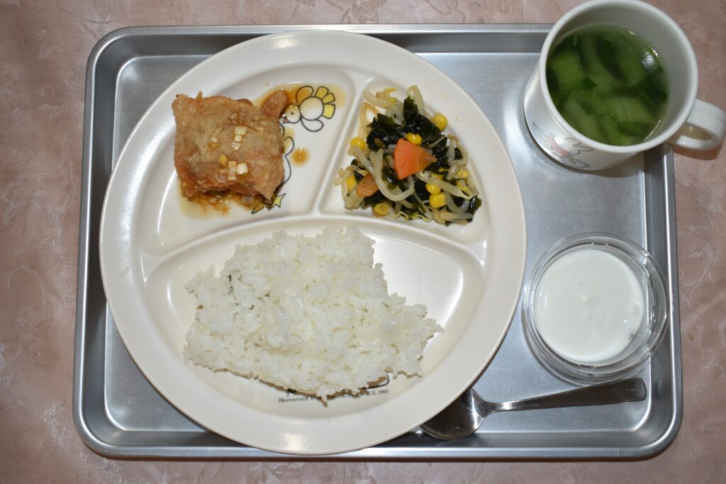 11/27 ごはん チンゲンサイの中華スープ 揚げ鶏の甘酢ねぎソース 中華風わかめサラダ ピーチヨーグルト