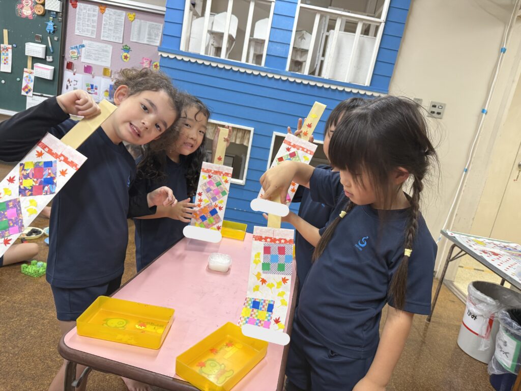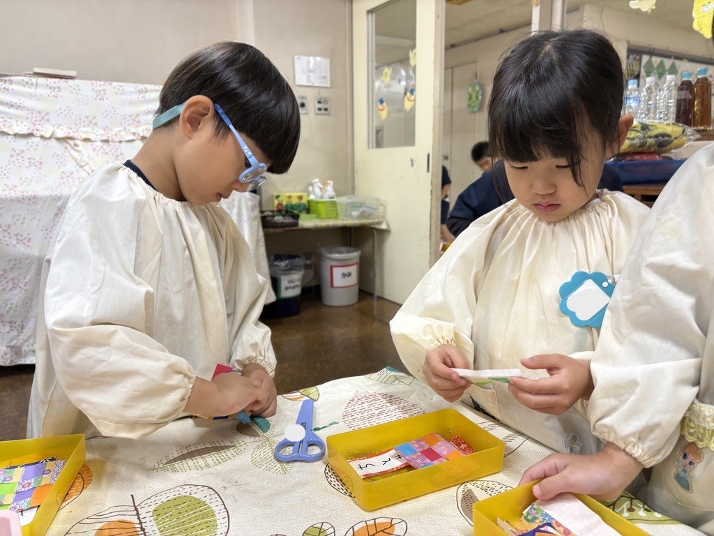 また、袋の装飾として11月の製作で行った織紙を折り紙で作り貼りました🎵