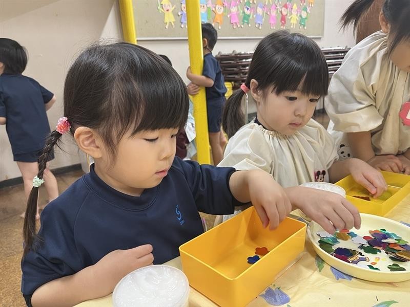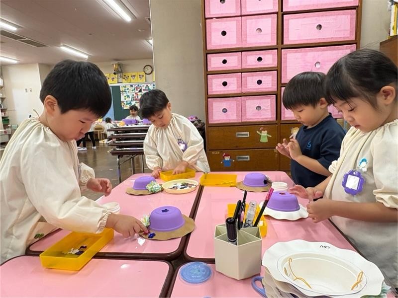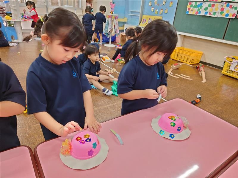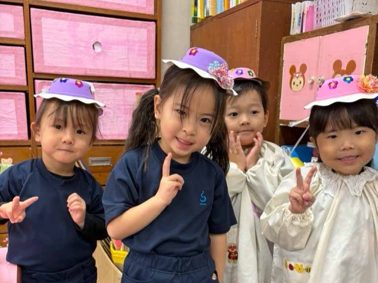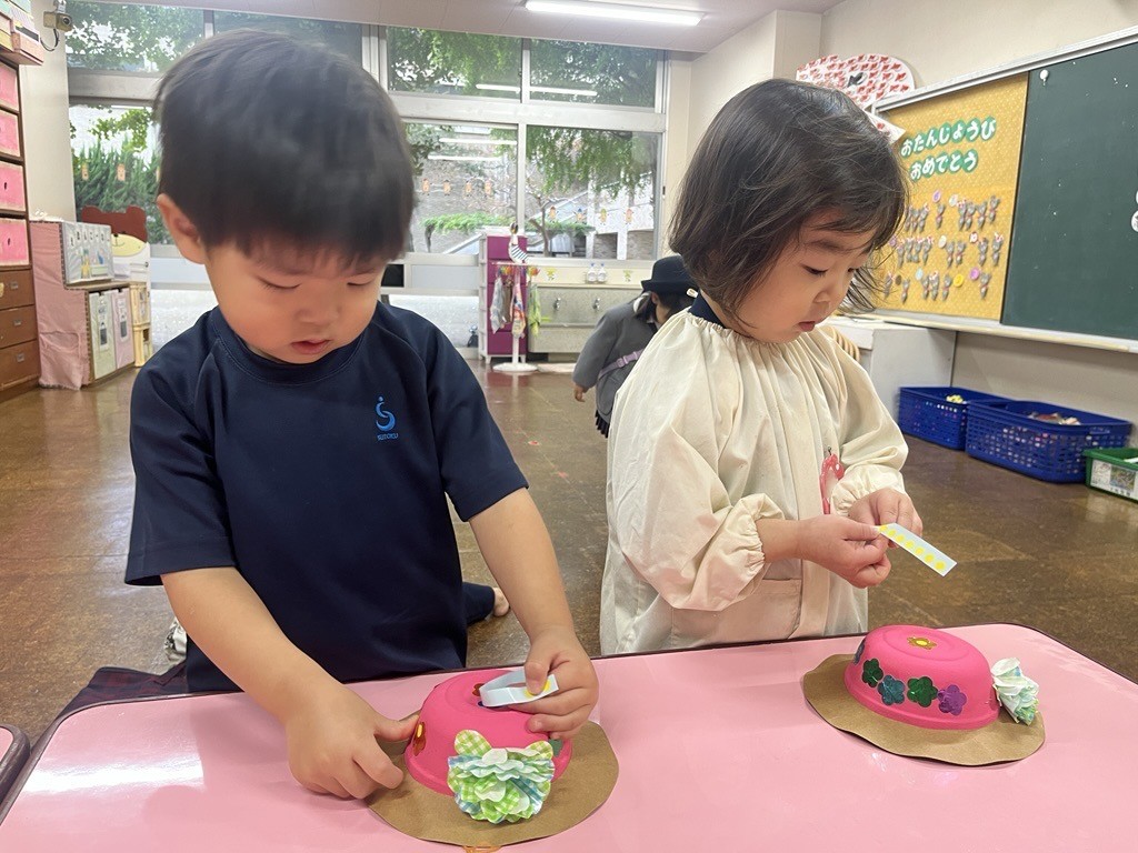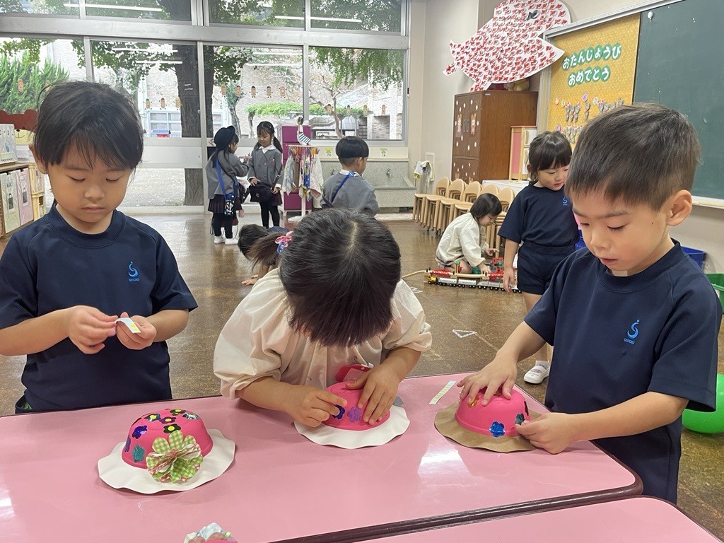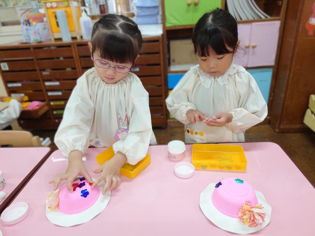 各クラスのカラーで彩られた帽子にキラキラのお花を貼りました💖