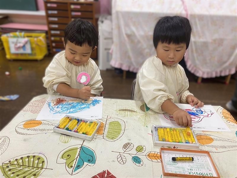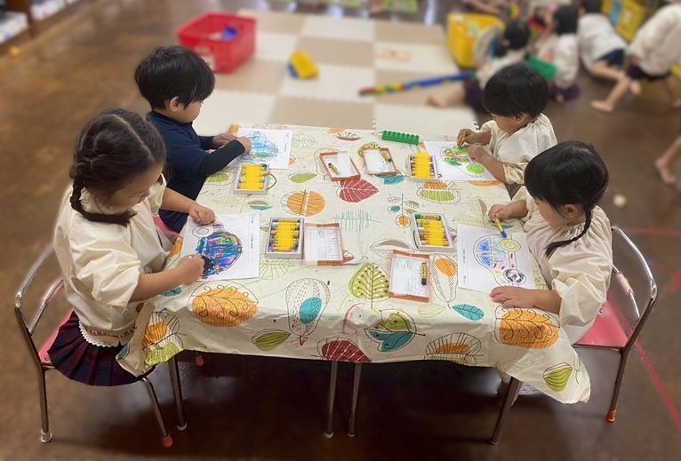 枠を意識し、はみ出さないように丁寧に塗る子もいれば、何色か細かく塗り分けている子も見られました。