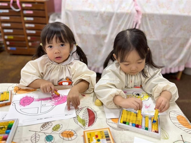 「赤がいい!」「タイヤは黒いよ」など、自分で好きな色のクレパスを選んで塗り絵を楽しみました。