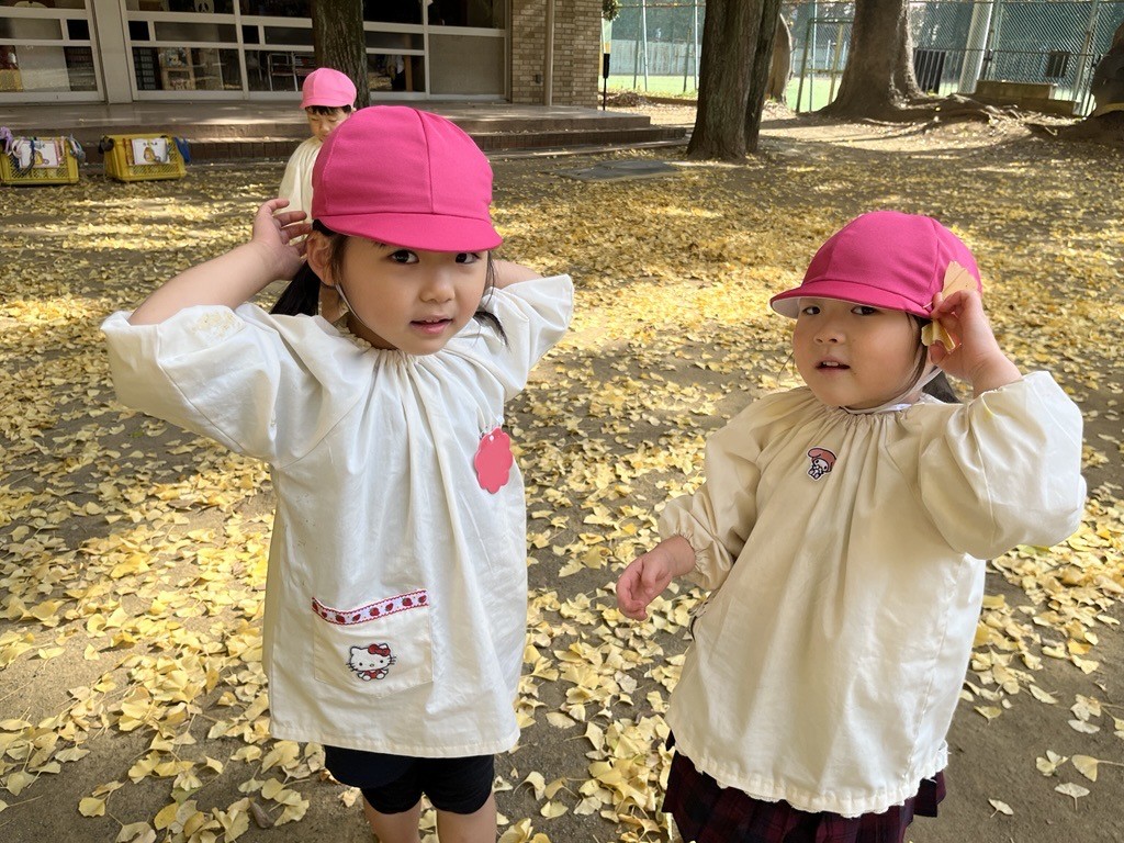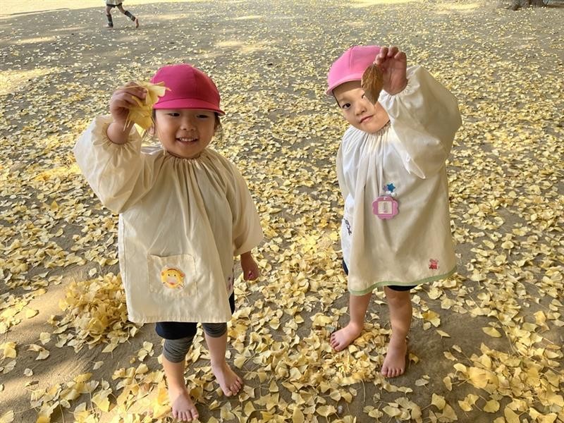 子どもたちは黄色のいちょうの葉に興味をもち、「ハートの形だね」「きれいな色だね」と友だちや先生と話す姿が見られました☺️