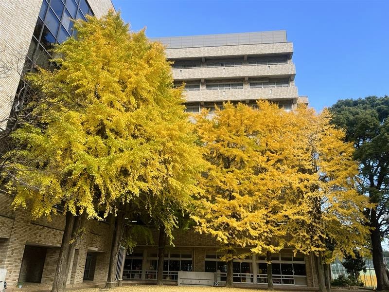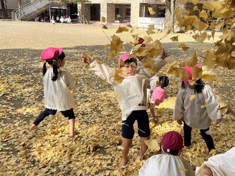 聖徳大学附属幼稚園では、園庭に大きないちょうの木があり、葉が黄色に色づいています!