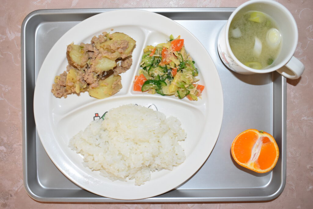 12/5 ごはん ねぎの味噌汁 肉みそじゃが芋 野菜と蒸し鶏のごま酢和え みかん