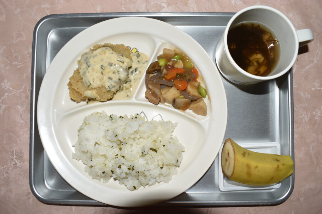 1/28 なめしごはん 白菜の味噌汁 白身魚の磯部焼き 筑前煮 みかんヨーグルト