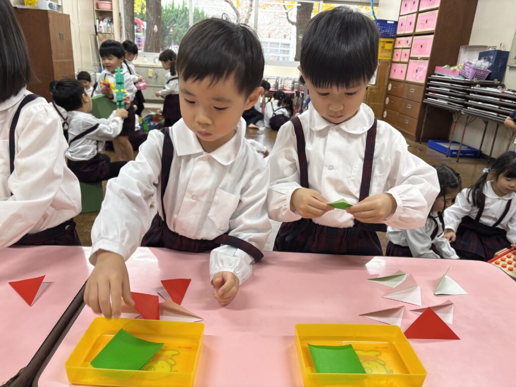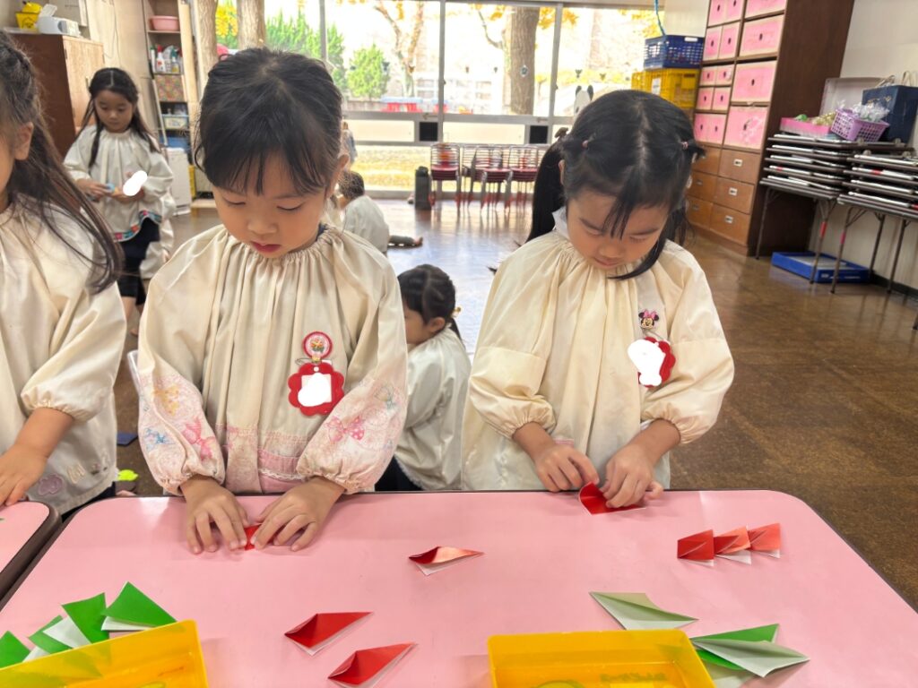 赤と緑の折り紙を4枚ずつ使い、同じ形に8回も折りました!