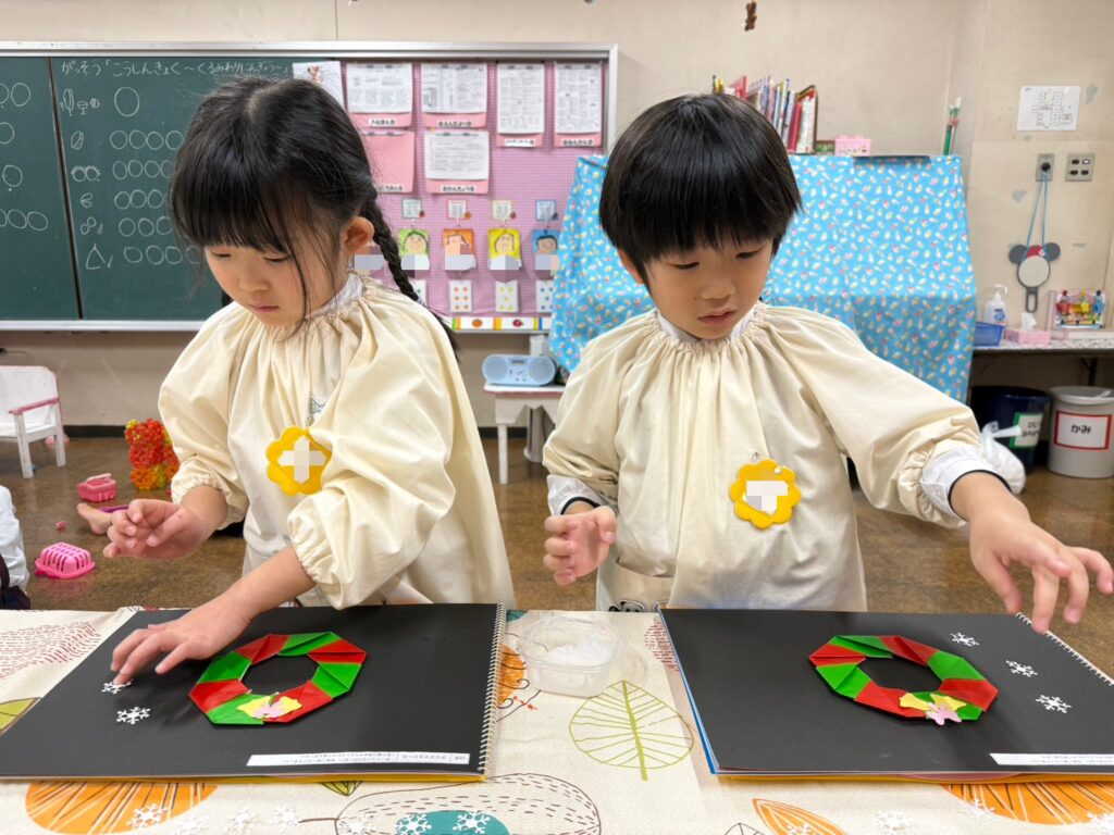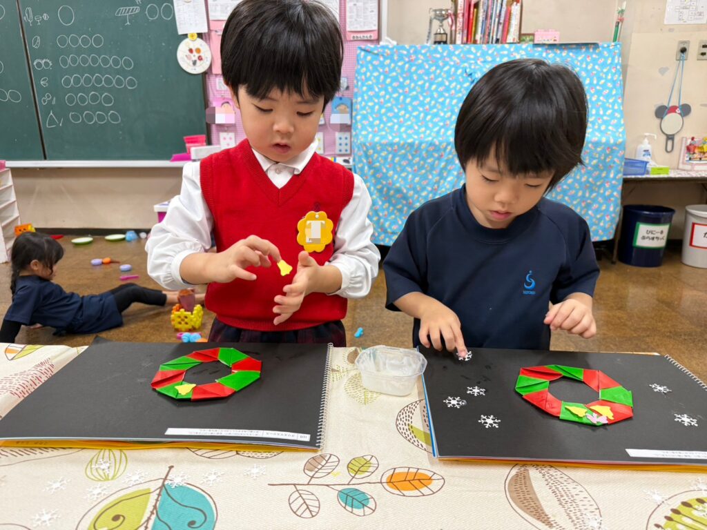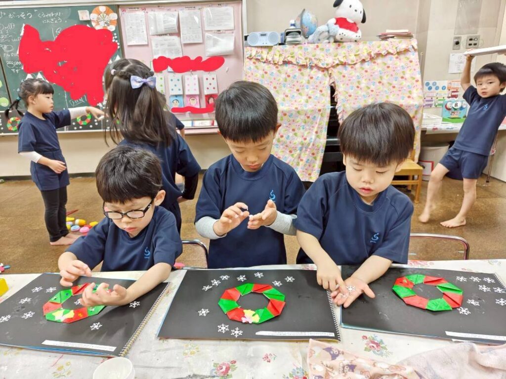 クリスマスが近づき、サンタさんからのプレゼントを楽しみにしている梅組の子どもたちはクリスマスリースの製作をしました🎅🎁