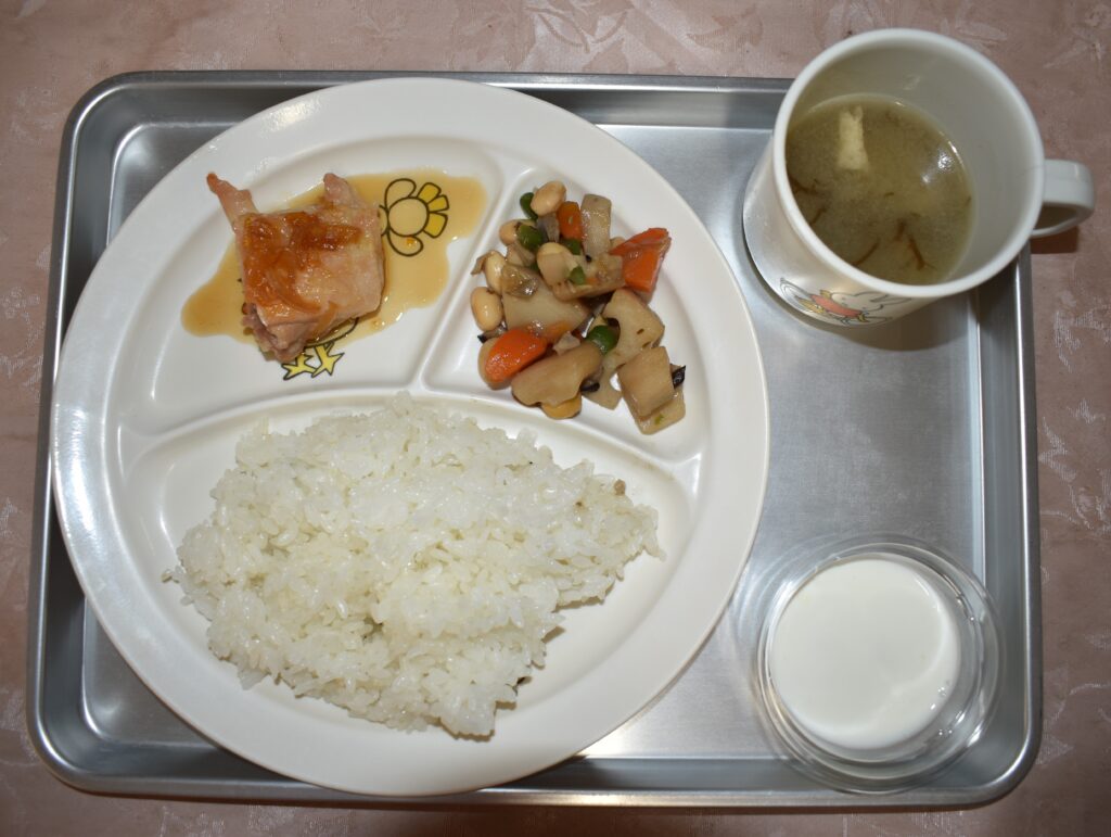 1/15 ごはん もずくの味噌汁 鶏肉のマーマレード焼き 五目豆 ピーチヨーグルト