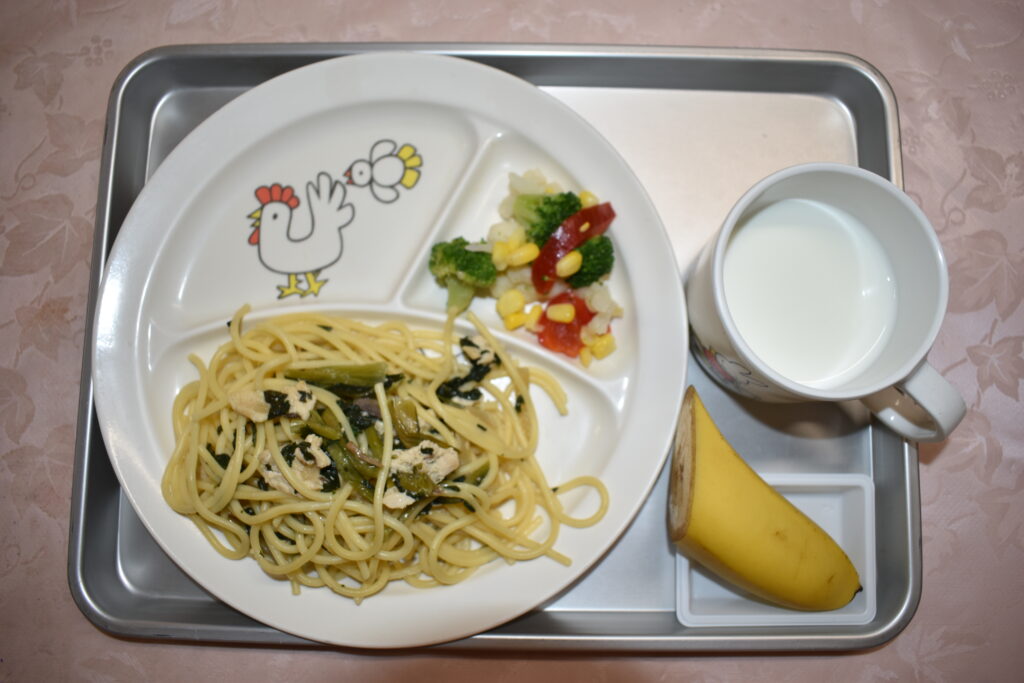 1/16 鶏肉と小松菜の和風スパゲッティ ミルク ミックスサラダ バナナ