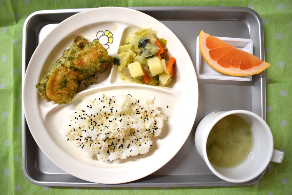 1/26 ごまふりかけごはん 大根の味噌汁 竹輪の磯部揚げ 野菜の和風煮 グレープフルーツ