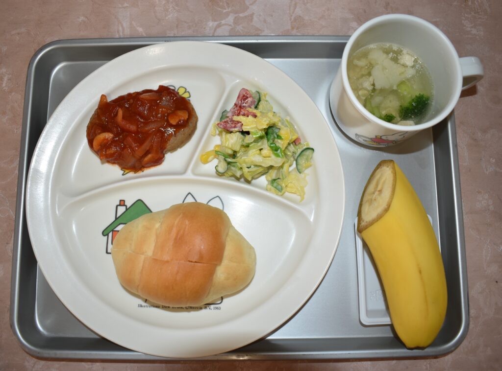 1/27 ハンバーガー 鶏肉と花野菜のスープ コールスローサラダ バナナ