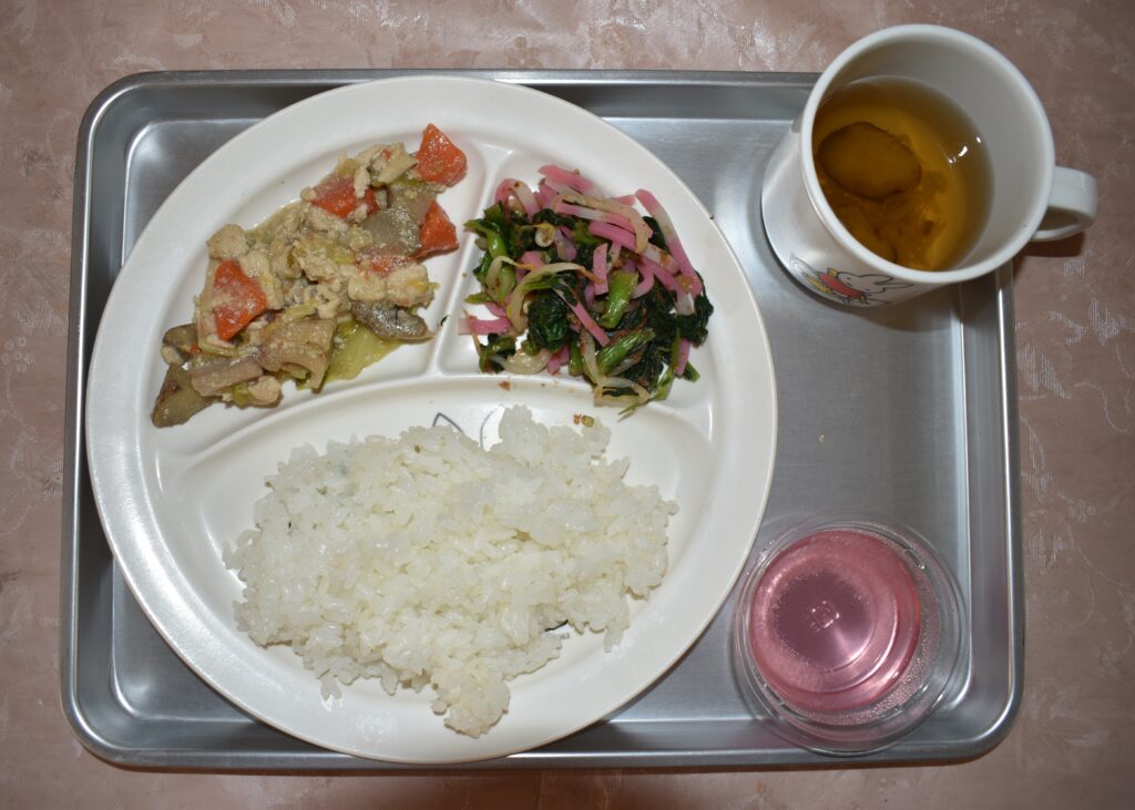 1/29 ごはん すまし汁 鶏肉と根菜の味噌炒め 小松菜とかまぼこのおかか和え いちごゼリー