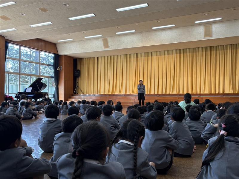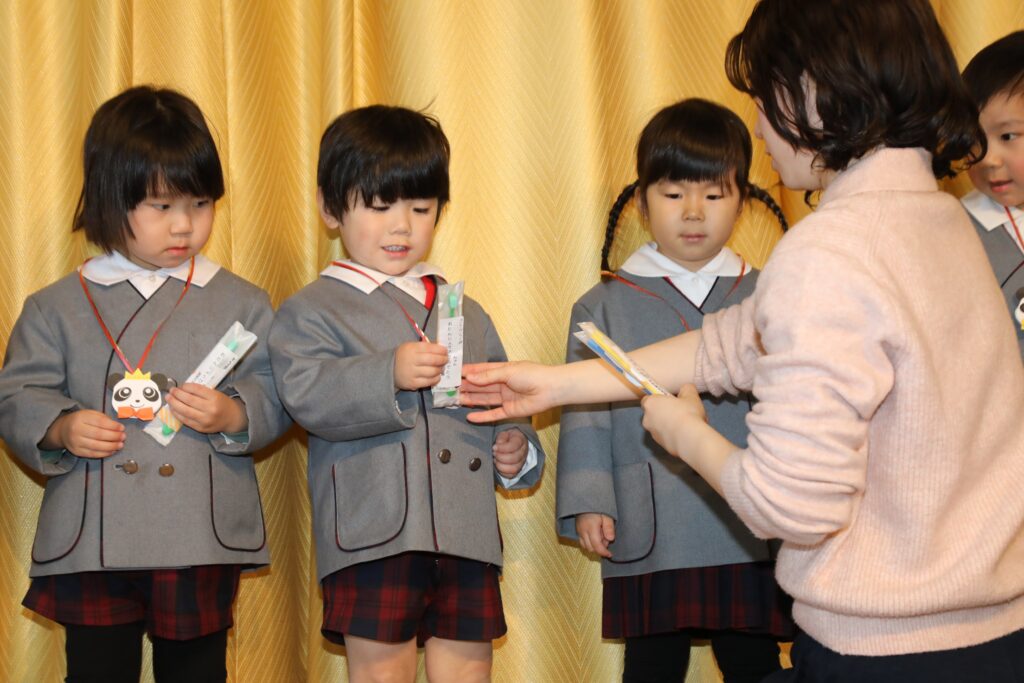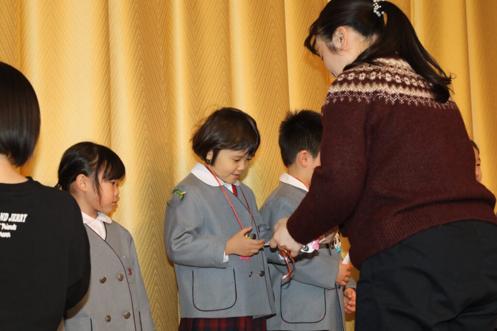 舞台の上に並んで担任の先生に紹介してもらい、ペンダントと歯ブラシをいただきました🥰