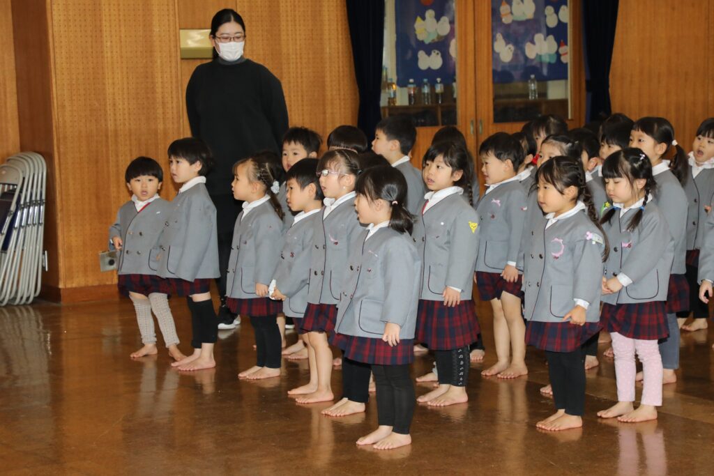 遊戯室に全園児が集まり、1月生まれのお友だちの誕生祝会を行いました。