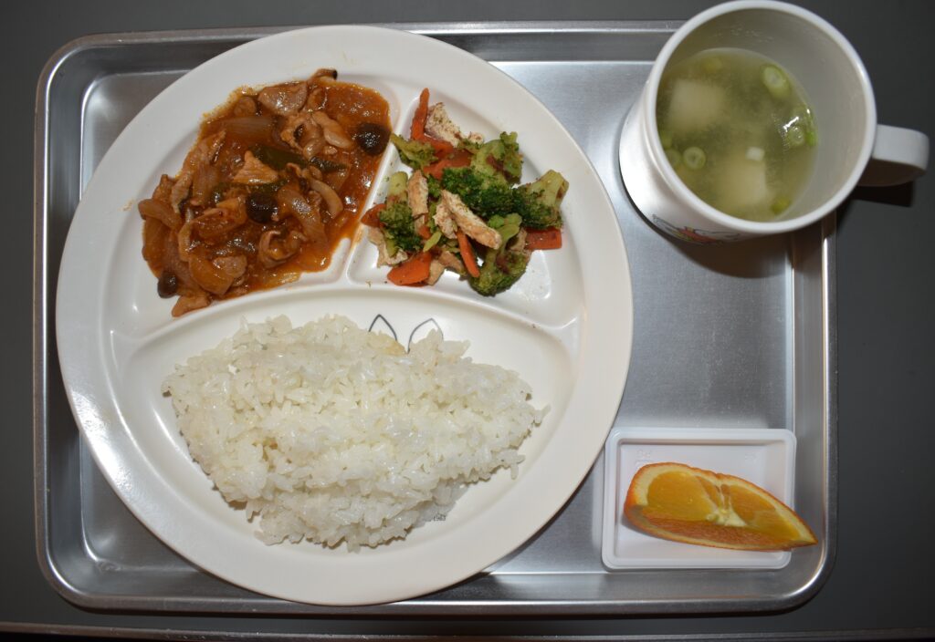 2/4 ごはん 里芋の味噌汁 ポークチャップ ブロッコリーと油揚げのおかか和え オレンジ