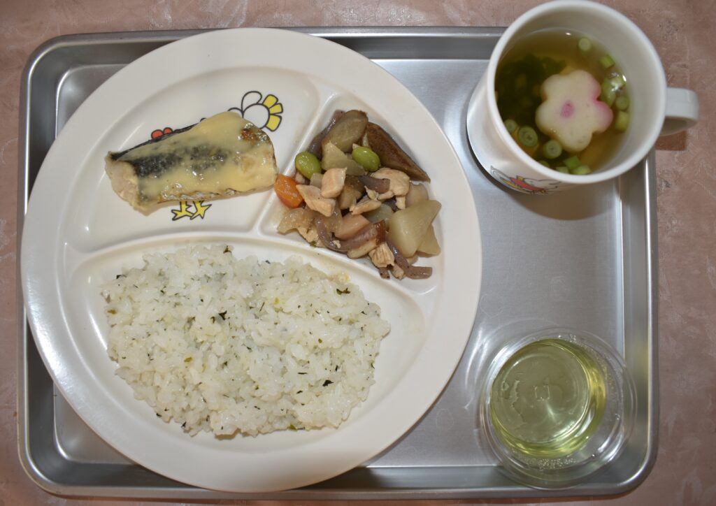 2/9 菜飯 花麩のすまし汁 鰆の味噌マヨネーズ焼き 筑前煮 青りんごゼリー