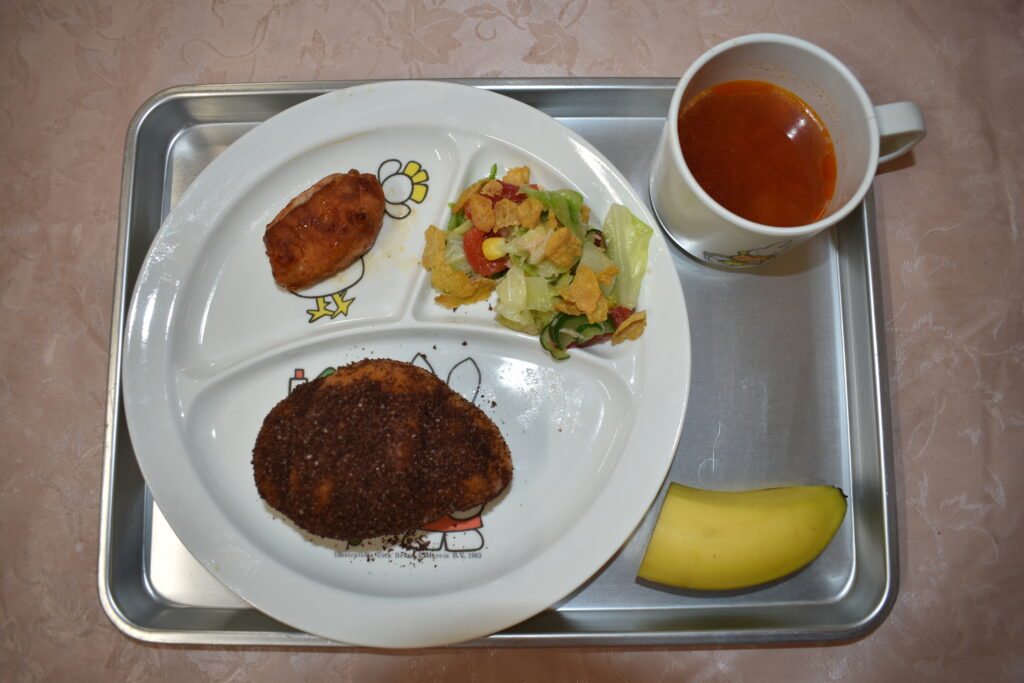 💖2/13 バレンタインメニュー🍫 ココアパン ミネストローネ 鶏肉のBBQソース コーンフレークサラダ バナナ