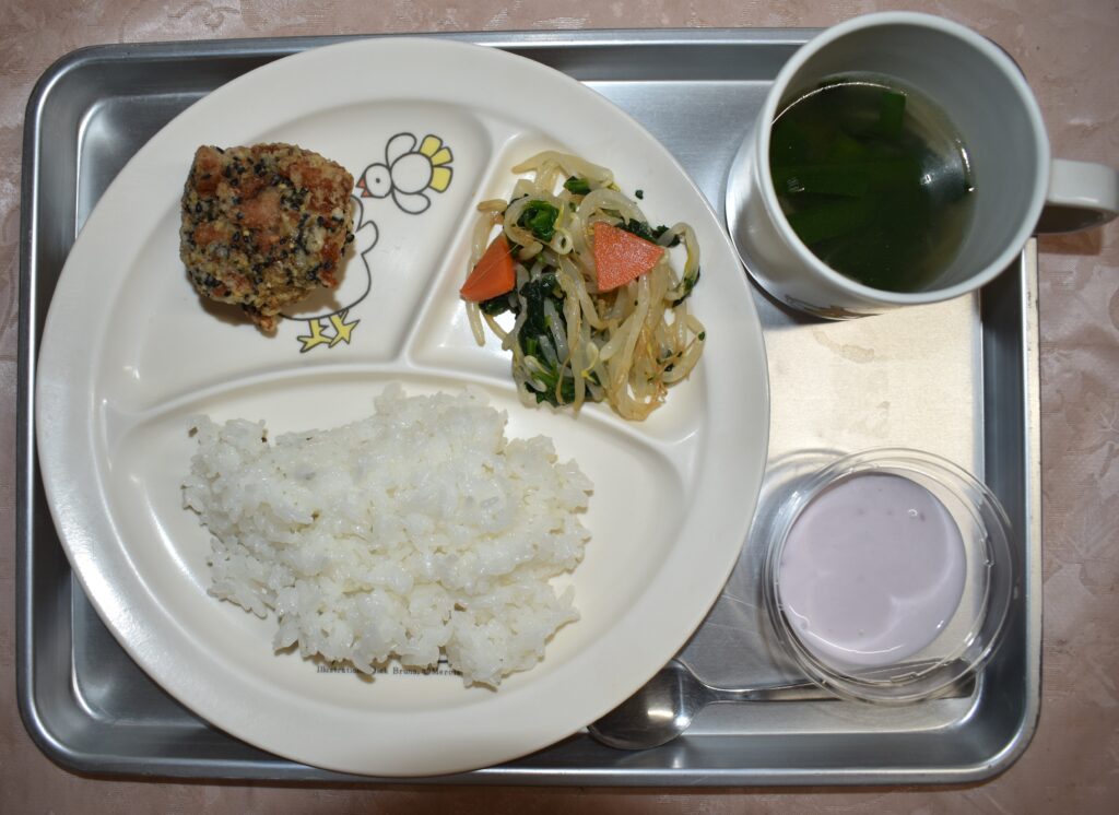 2/17 ごはん ニラの中華スープ 鶏肉のごま揚げ もやしの中華風和え物 ブルーベリーヨーグルト
