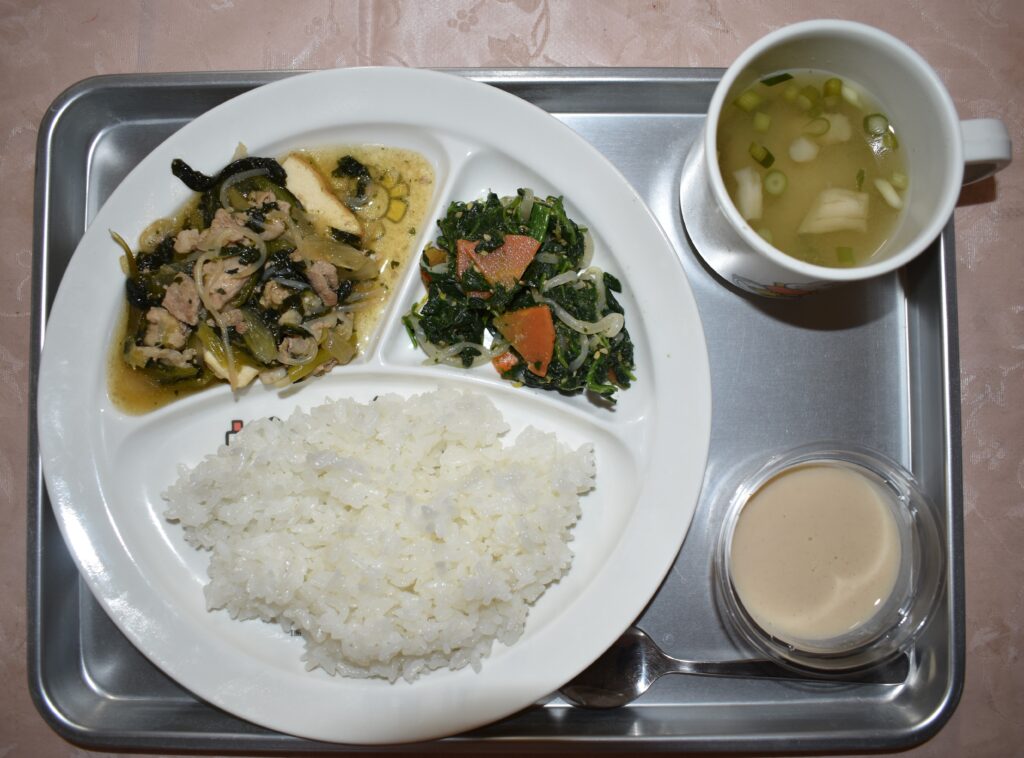 2/24 ごはん しめじの味噌汁 豚肉のうま煮 ほうれん草の和風サラダ きなこ豆乳かん