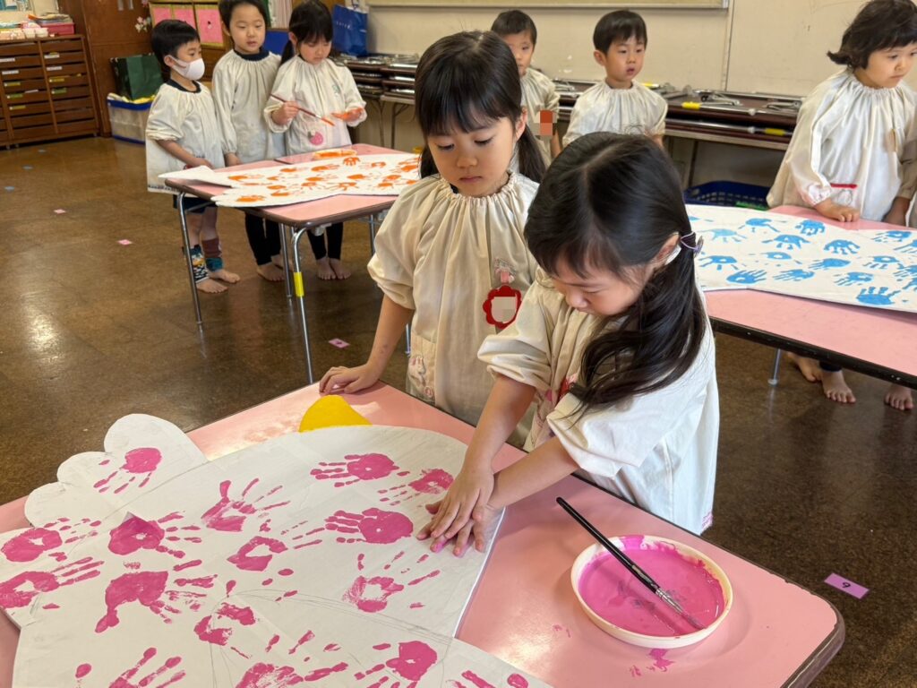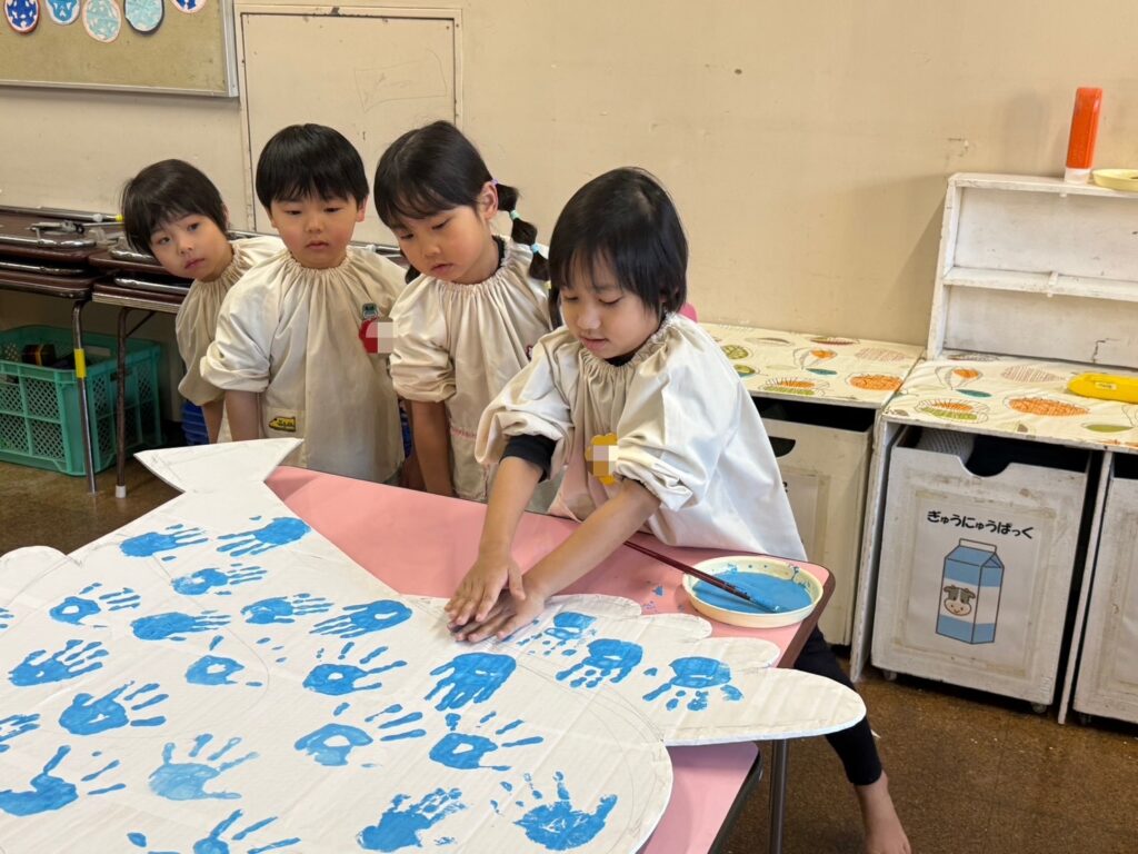 今回はことりの大道具がリズムあそびの中に登場しますが、子どもたちの手形で色を付けた大道具になっています🐦