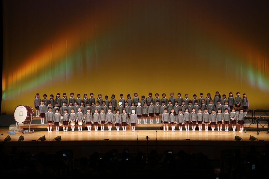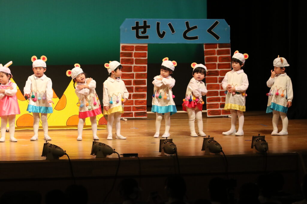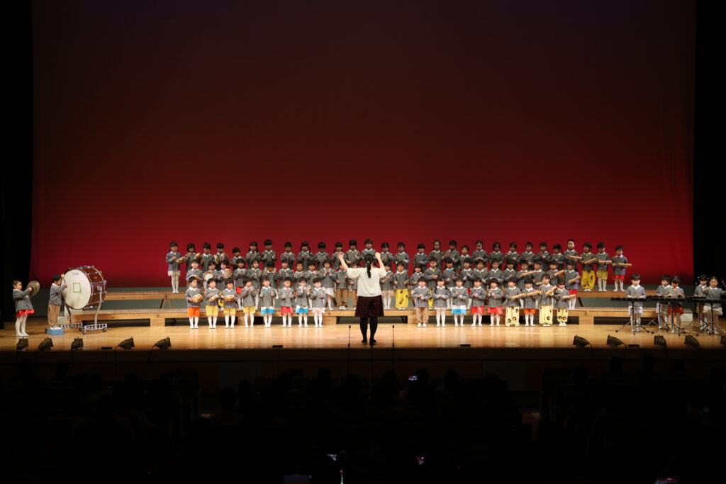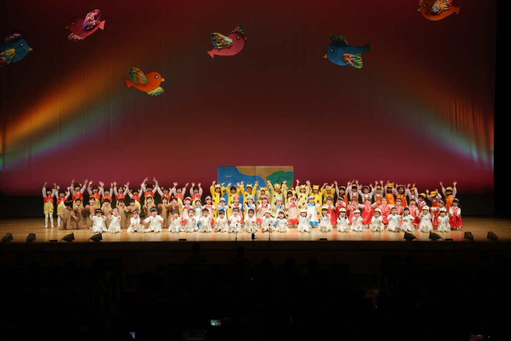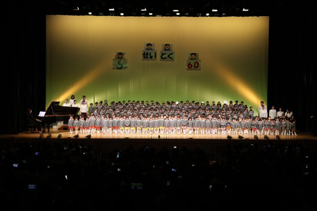 パンダ組、桜組、梅組、松組の全園児が舞台に揃い、『幼稚園園歌』『せいとくマーチ』を歌いました🎤みんなと先生たちの歌声が講堂いっぱいに広がりましたね💖