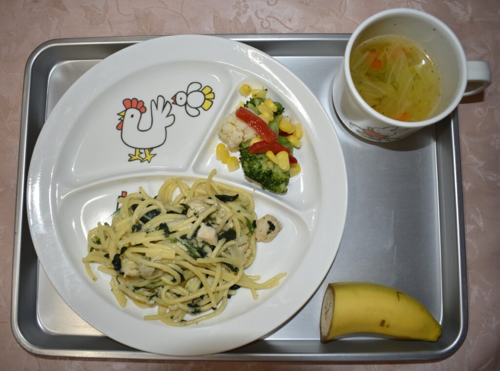3/6 鶏肉とほうれん草のクリームスパゲッティ 白菜のコンソメスープ 花野菜のサラダ バナナ