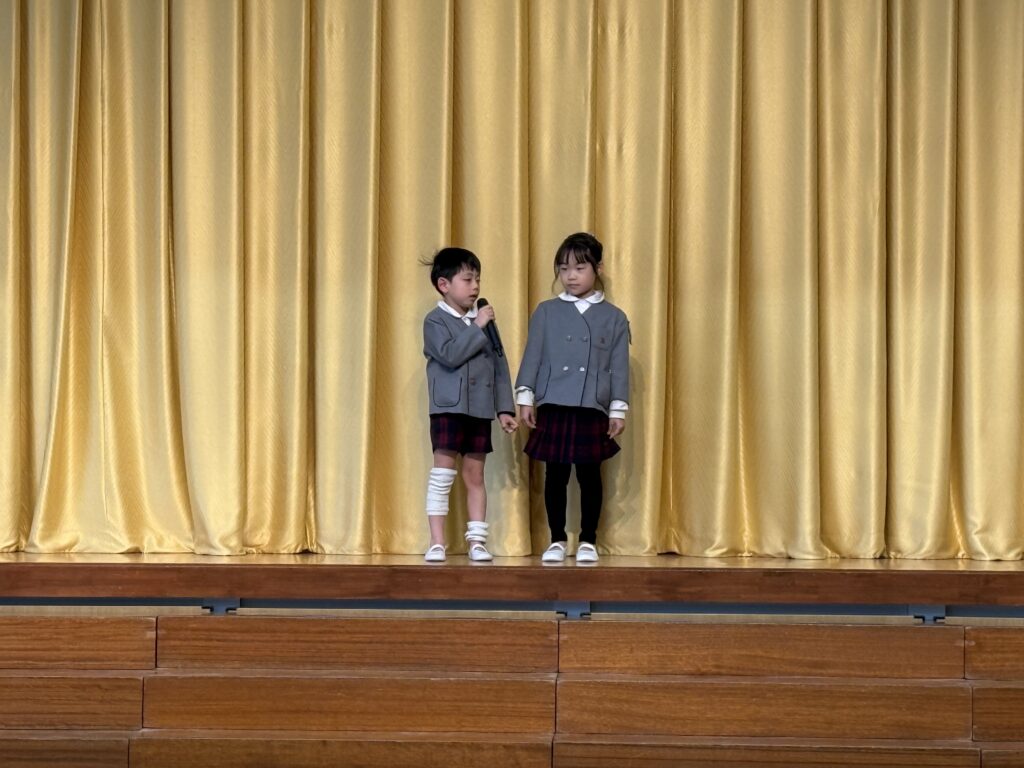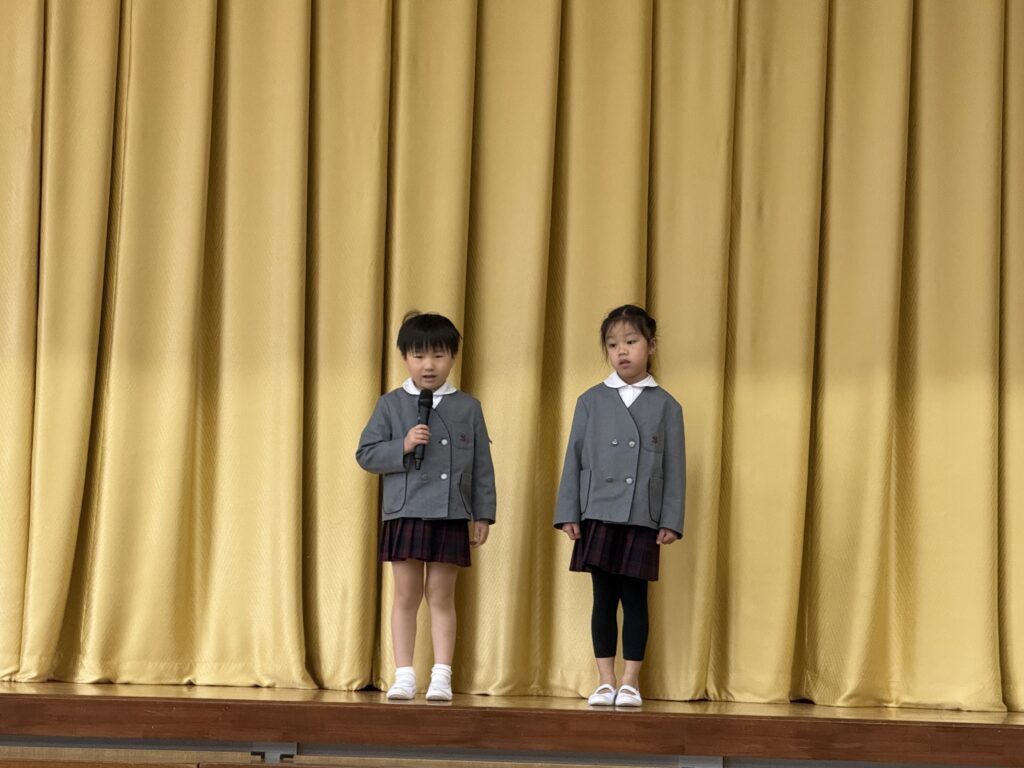 本日、幼稚園ではひなまつり会を行いました。松組のはじめの言葉で会が始まりました。