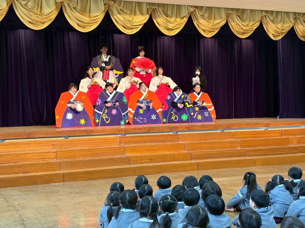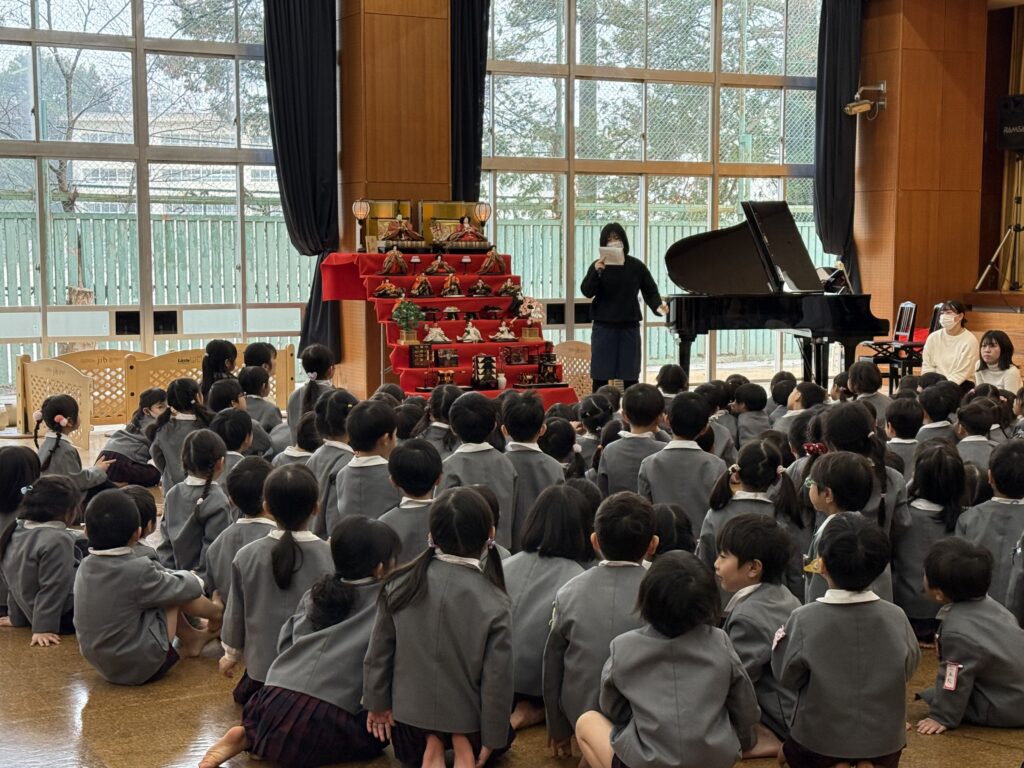 雛人形に変身した先生が登場し、ひなまつりの由来やそれぞれの役割について楽しく知ることができました。おひなさまのクイズでもお話をよく聞き、正解したおともだちがたくさんいましたね👏