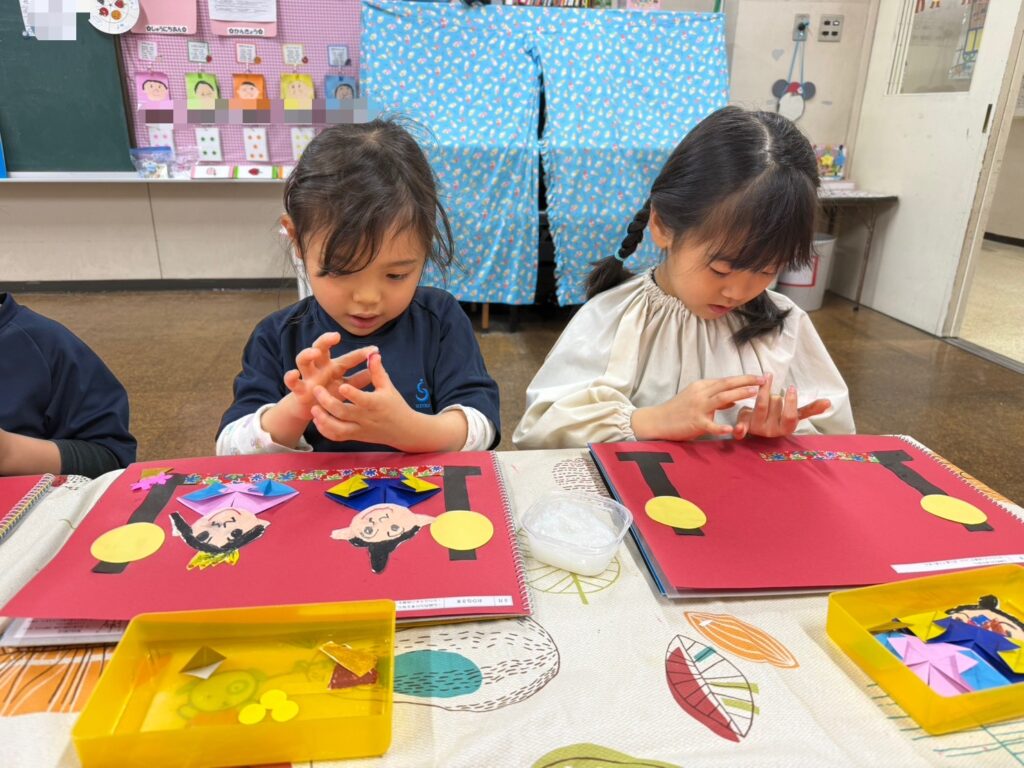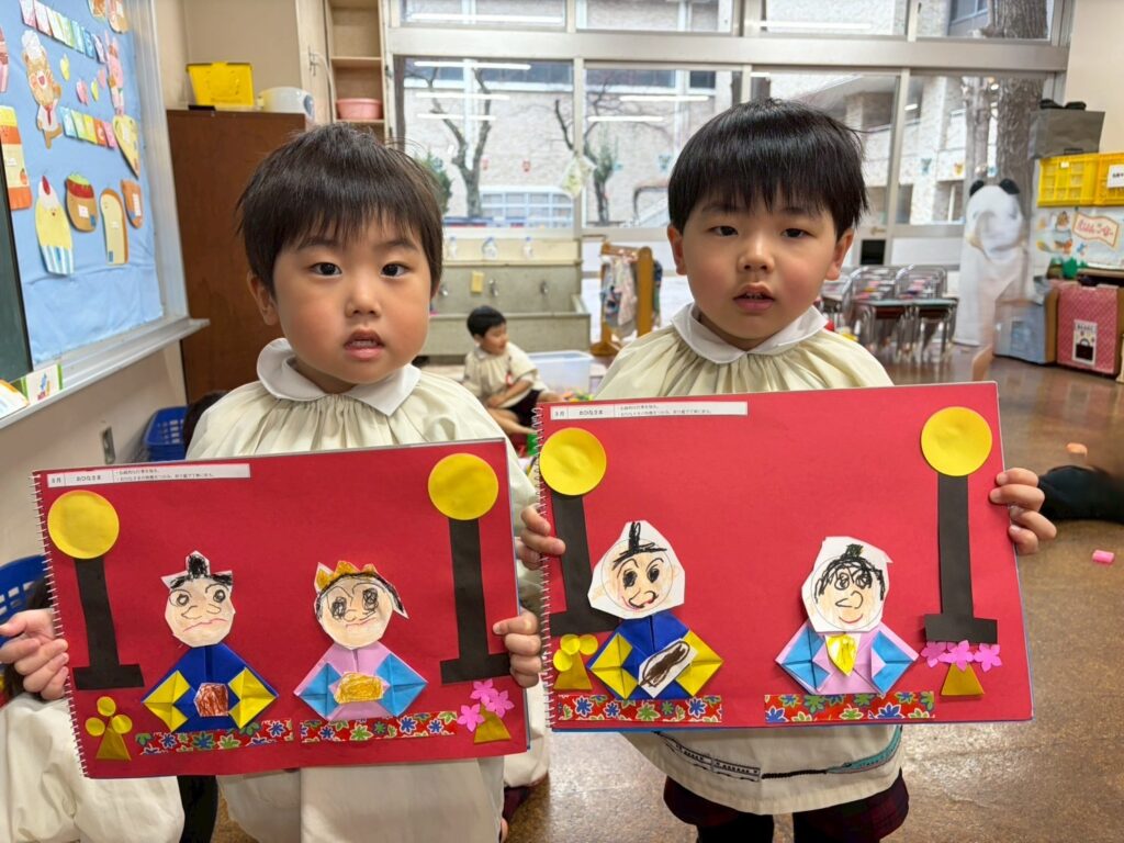 伝統的な行事を知り、おひなさまの特徴をつかんで折り紙を丁寧に折ることをねらいとしています🪄